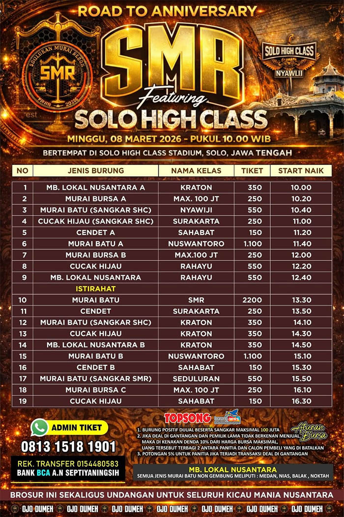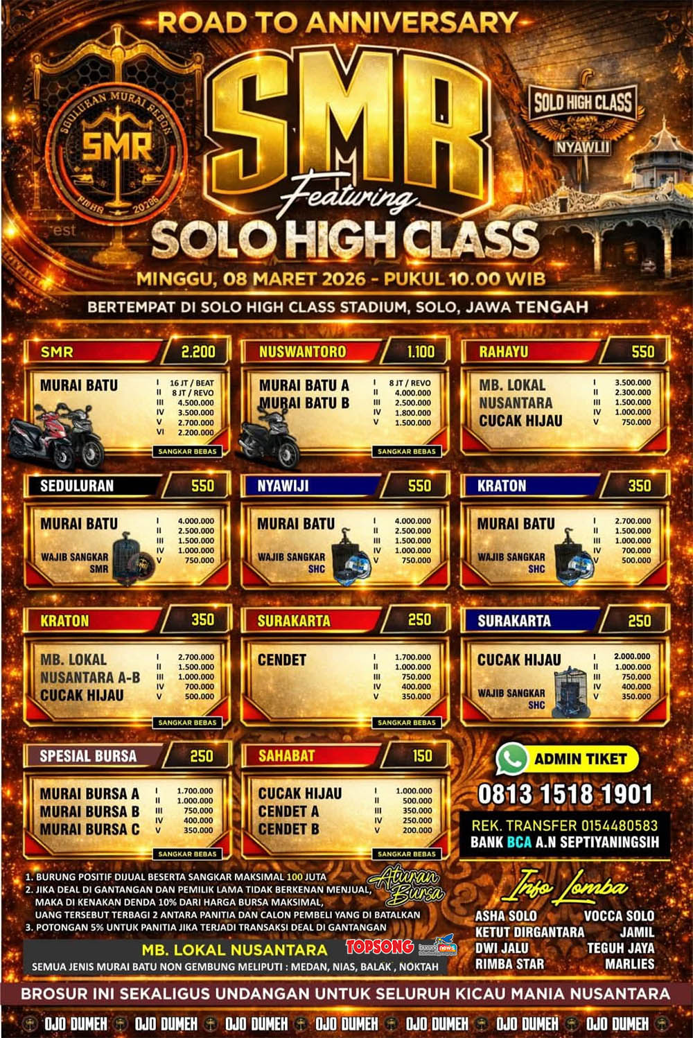 Event Ramadhan Mubarak (01 Maret 2026) di gantangan Galang Arena, Jl. Trunojoyo, Kepanjen, Kab. Malang berjalan sukses. Bahkan dikelas bursa terjadi deal dua kali, satu di murai dan satunya di cucak hijau.