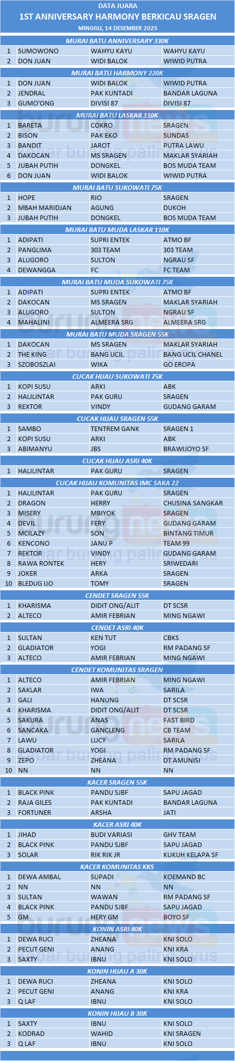 1st Anniversary Harmony Berkicau yang digelar pada Minggu, 14 Desember 2025 di Taman Sragen Harmony Hijau Sragen berlangsung sukses. Tak hanya didominasi oleh pemain lokal, event yang diprakarsai oleh Pak Narto ini juga diikuti oleh pemain Solo, Boyolali, Karanganyar, dan Ngawi.