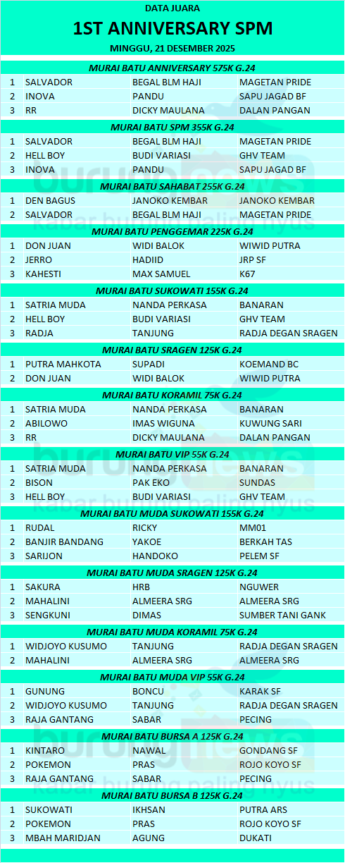 1st Anniversary SPM (Sahabat Penggemar Murai) yang digelar pada hari Minggu, 21 Desember 2025 di halaman Koramil 01 Sragen berlangsung lancar dan kondusif. Selain didominasi pemain lokal, event yang diprakarsai oleh Mbah Jarot dan Cang Heri ini juga diikuti oleh pemain Solo, Purwodadi, Ngawi, dan Magetan.