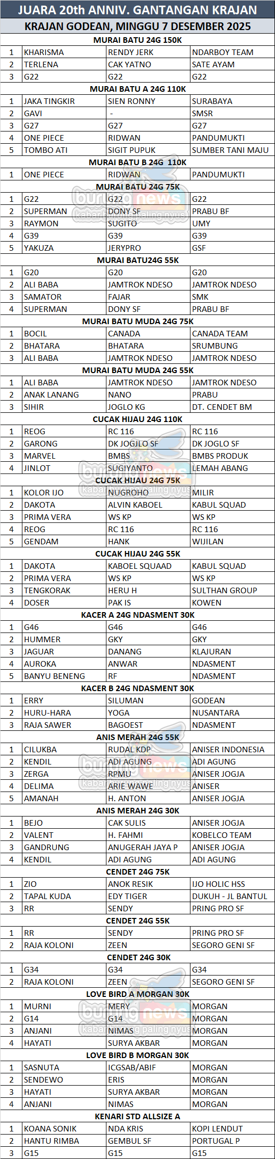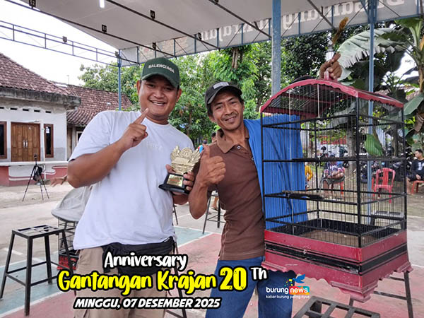 Tahun ini, gantangan yang terletak di kampungg Krajan, Sidokerto, Godean, Sleman, tak terasa sudah berusia 20 tahun. Event pada Minggu 7 Desember, tak lain dalam rangka memperingati hari jadi tersebut. Hampir semua kelas ful G-24, hanya pada sebagian kelas terlihat kosong 1-2 gantangan, terutama kelas Kenari.