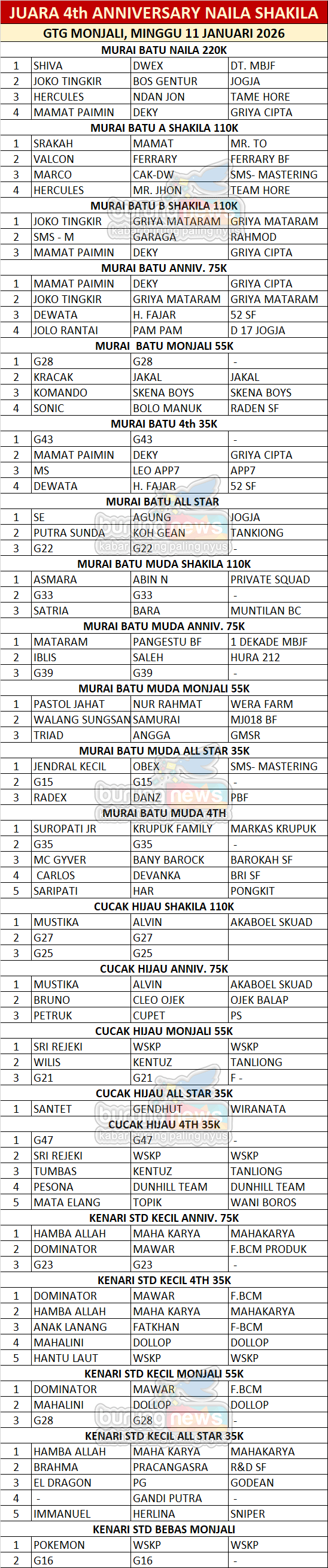 Gantangan Monjali cukup meriah dengan hadirnya para kicauamania pada Minggu, 11 Januari 2026. Rizal dan kawan-kawan membuka gelaran dalam rangka 4th Anniversary Naila Shakila, dengan tiket terjangkau dan hadiah menarik.