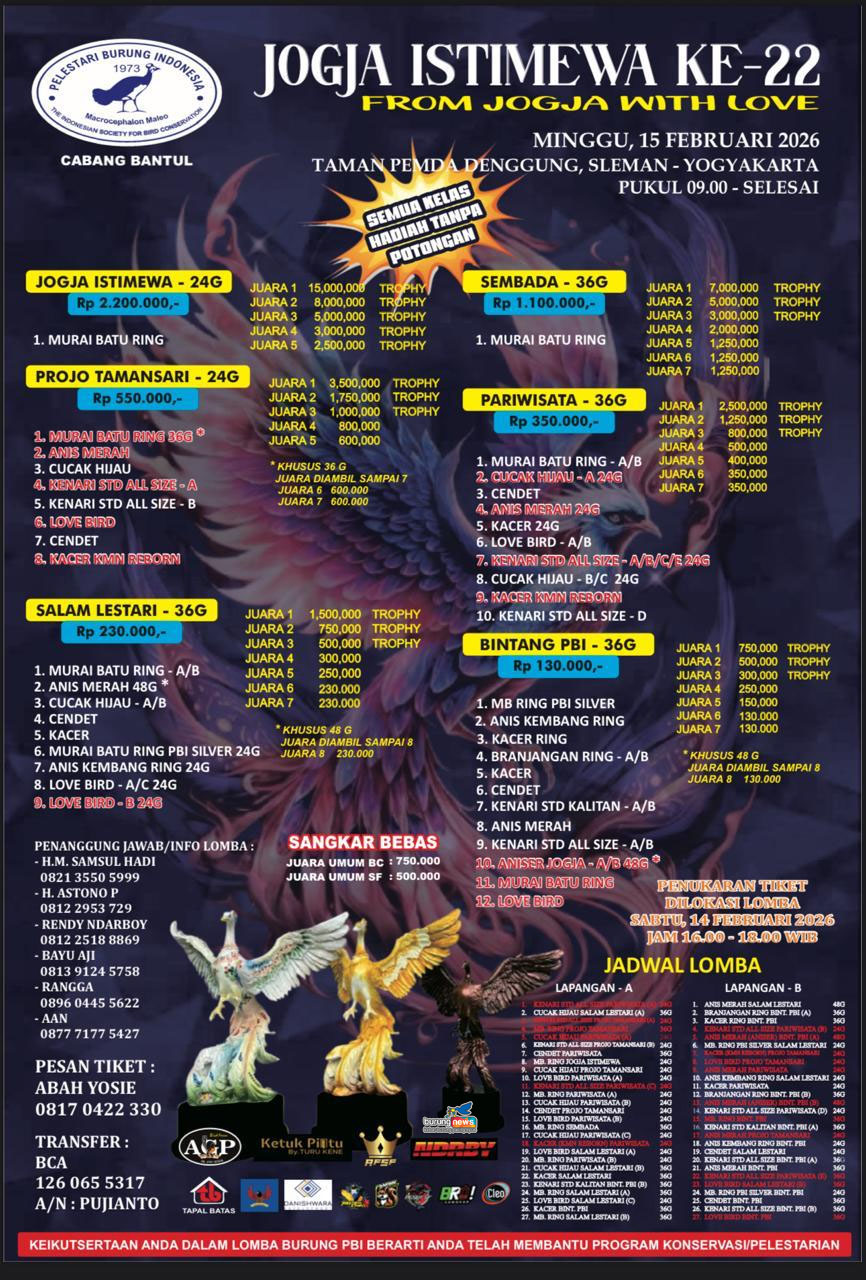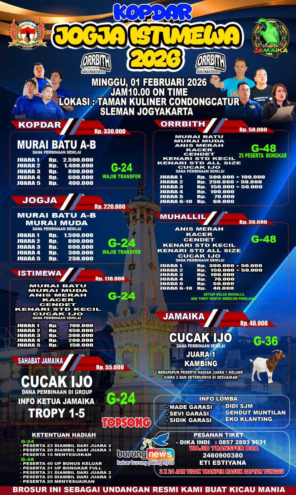 Para kicaumania kembali ditunggu pada sejumlah event menarik, mulai dari Burungnews Award Feat KMN Reborn pada 25 Januari di Solo High Class, Kopdar Jogja Istimewa pada 1 Februari di Taman Kuiliner, Solo Kota Budaya pada 8 Februari di Taman Balekambang Solo, dan gong awal tahun adalah Jogja Istimewa ke-22 di Lapangan Pemda Sleman pada 15 Februari 2026. [busro]