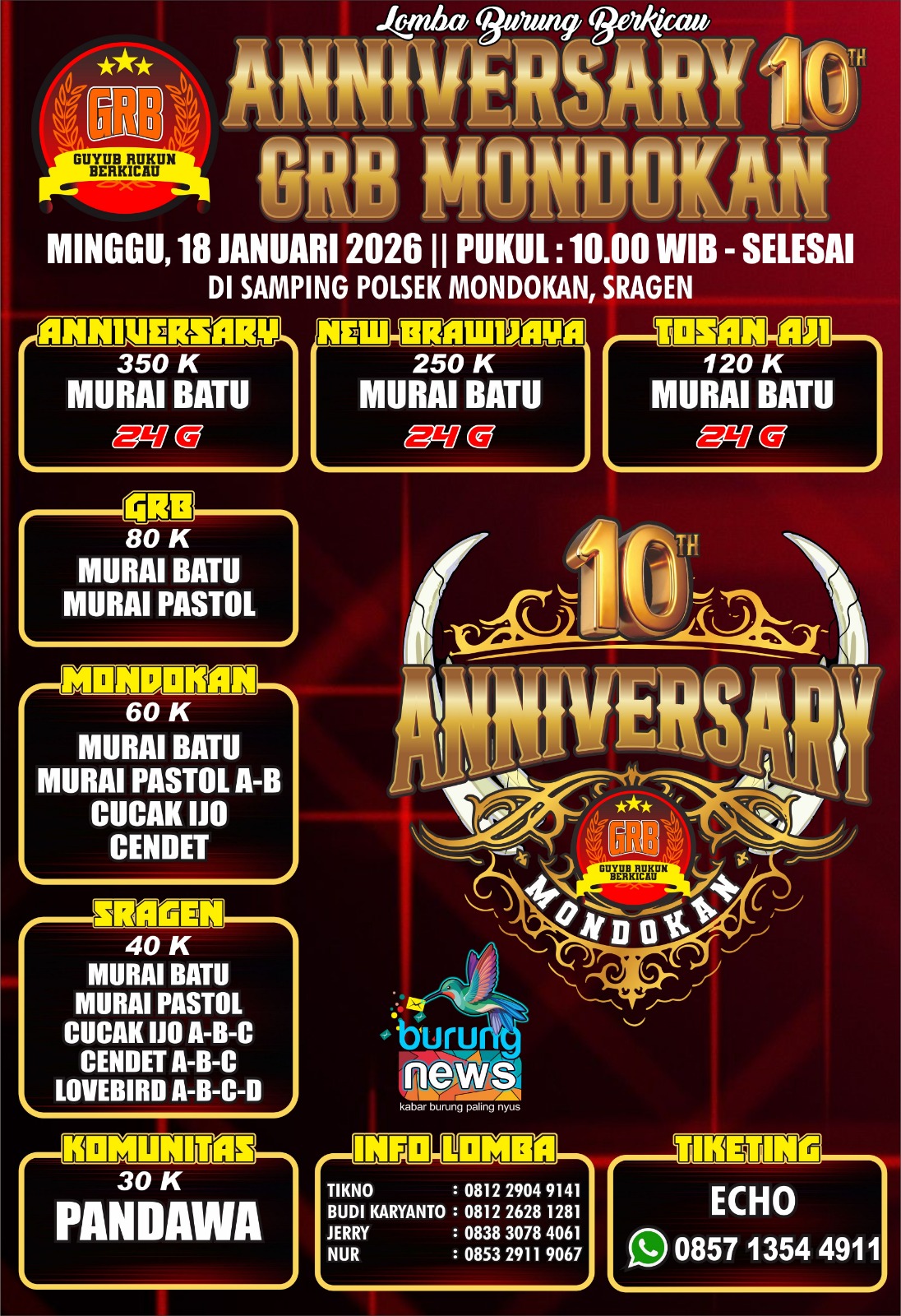 ANNIVERSARY 10 GRB MONDOKAN SAMPING POLSEK MONDOKAN Minggu, 18 Januari 2026 Jam 10:00 Diliput oleh burungnews.com DOWNLOAD BROSUR