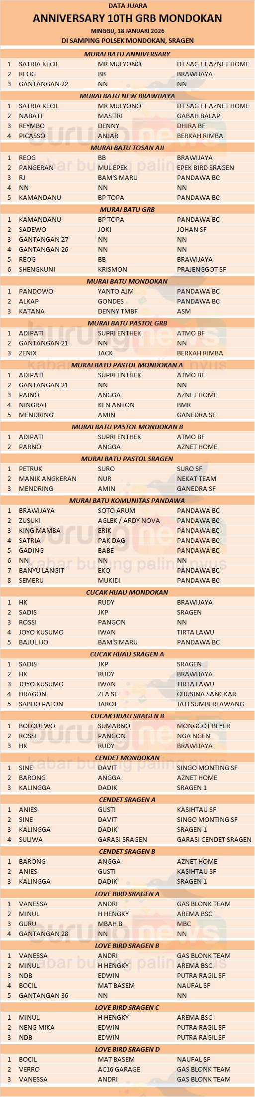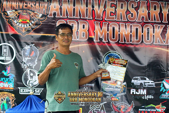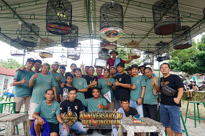 Anniversary 10th GRB Mondokan Sragen yang dilaksanakan pada hari Minggu, 18 Januari 2026 di Samping Polsek Mondokan, Sragen berlangsung sukses. Event tahunan yang diprakarsai oleh GRB Team (Guyub Rukun Berkicau) ini diikuti oleh pemain Solo, Sukoharjo, Ngawi, Purwodadi, Klaten, dan Boyolali.