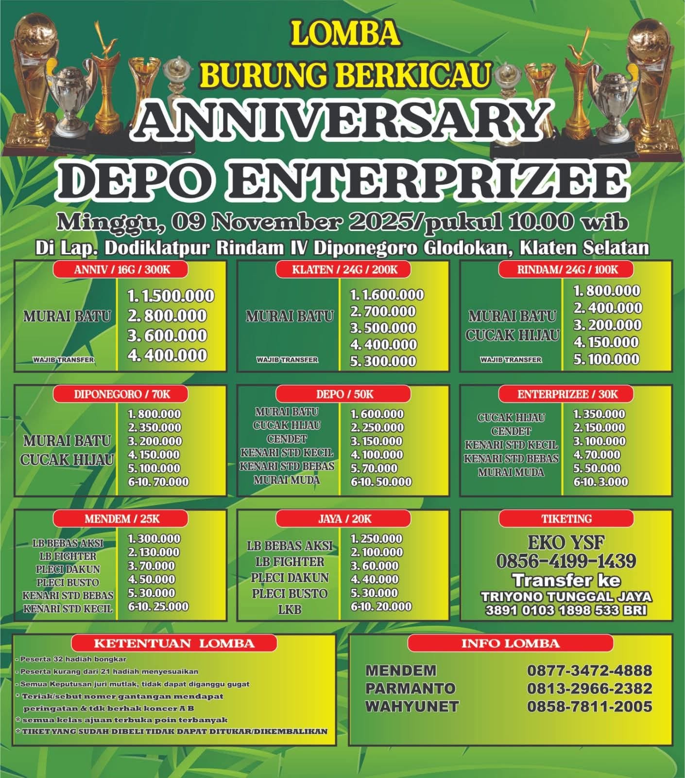 ANNIVERSARY DEPO ENTERPRISE LAP DODIKLATPUR Minggu, 09 November 2025 Jam 10:00 Diliput oleh burungnews.com DOWNLOAD BROSUR