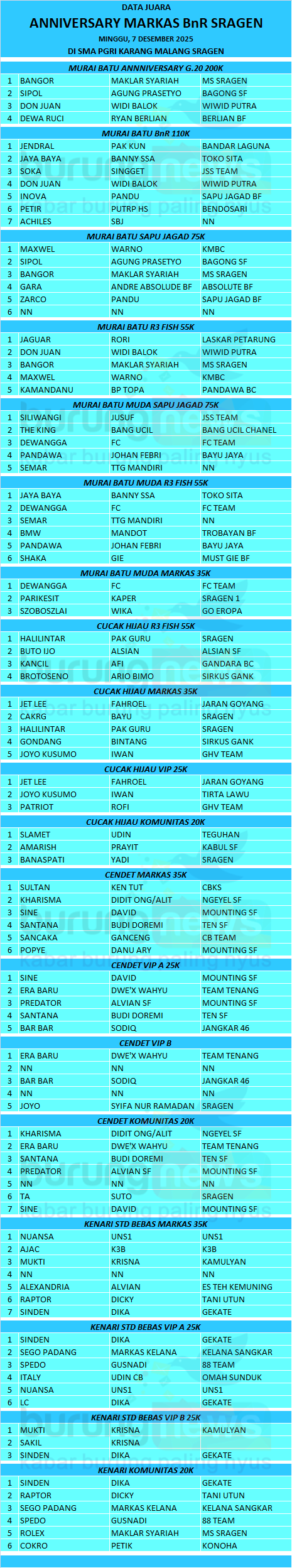 Anniversary Markas BnR Sragen yang dilaksanakan pada Minggu, 7 Desember 2025 di SMA PGRI Karangmalang Sragen berlangsung sukses. Lomba yang digelar dalam rangka HUT Markas BnR Sragen ke 4 ini selain didominasi oleh pemain lokal, juga diikuti oleh pemain dari Boyolali, Solo, Sukoharjo, Wonogiri, Purwodadi, dan Ngawi.