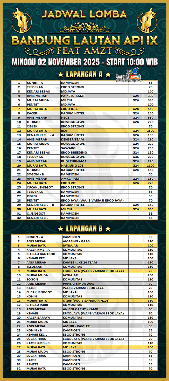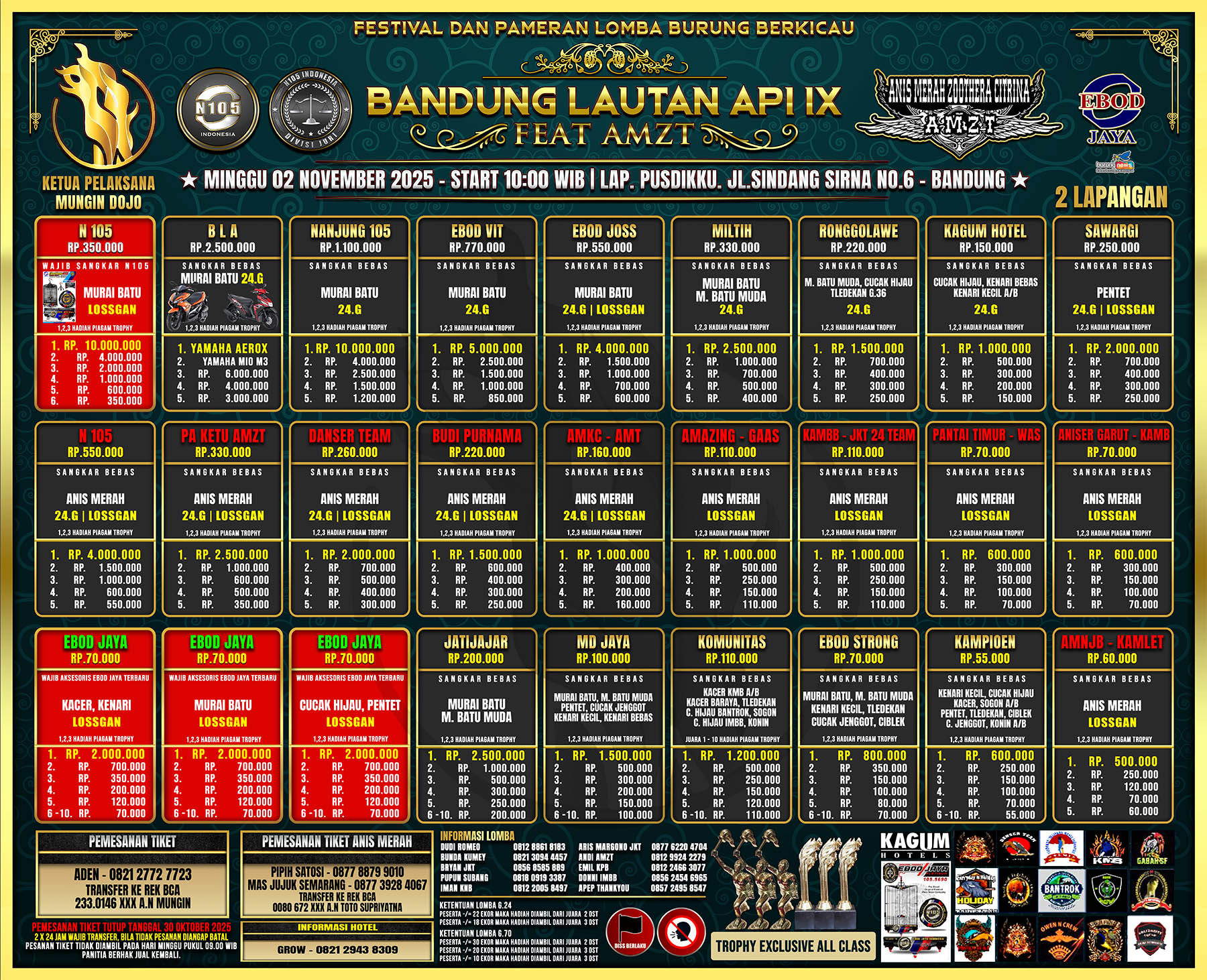 Anda para penggila branjangan dan jalak suren, kalau pengin dimanjakan, pastikan 9 September besuk merapat ke Bandung. Pada even spektakuler Bandung Lautan Api Cup II ini, masing-masing akan dimainkan 4 kali.