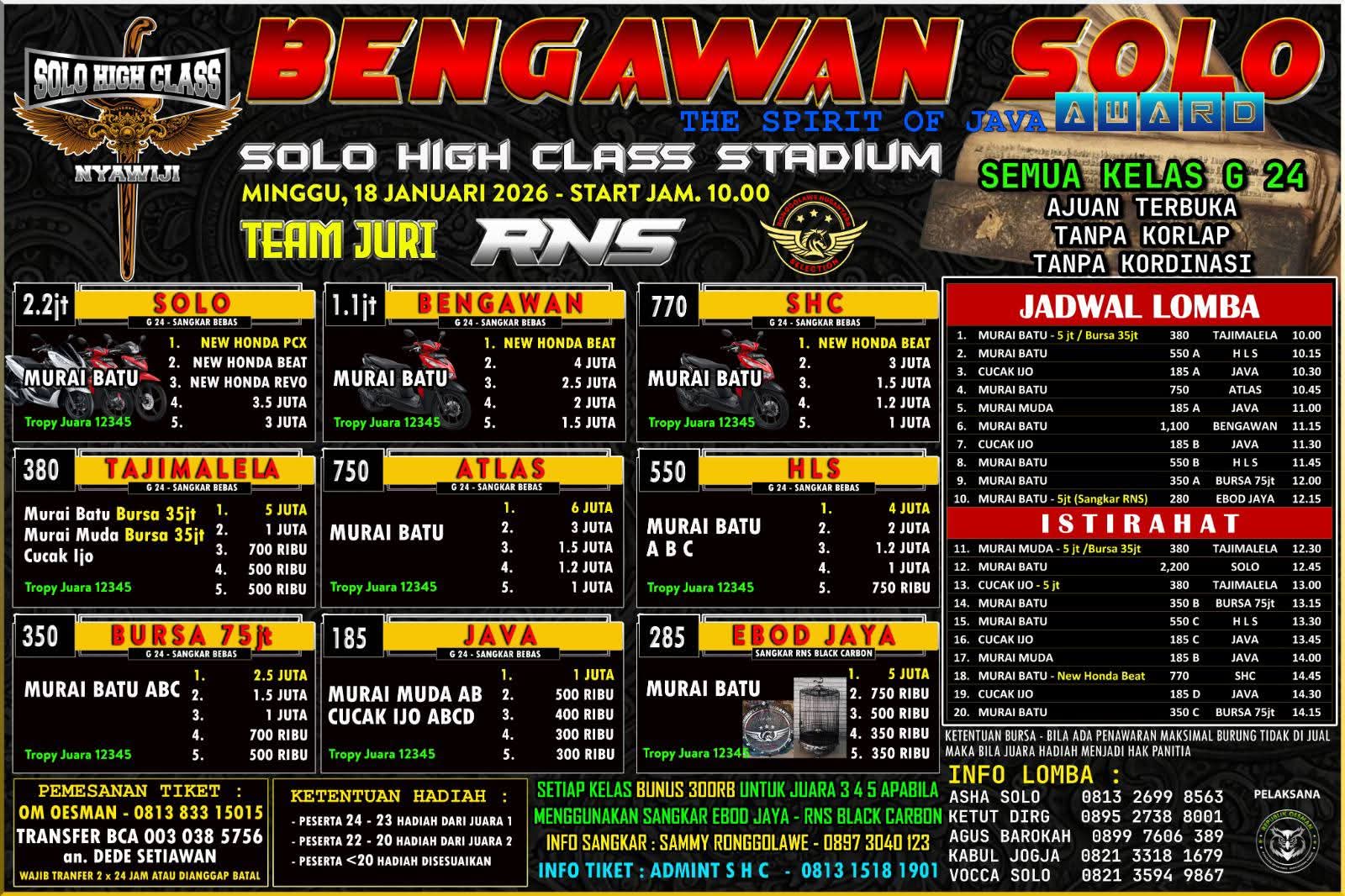 BENGAWAN SOLO AWARD SOLO HIGHCLASS STADIUM Minggu, 18 Januari 2026 Jam 10:00 Diliput oleh burungnews.com DOWNLOAD BROSUR