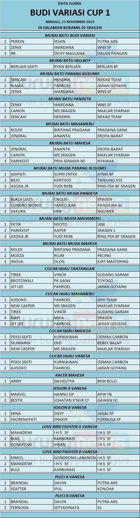 Budi Variasi Cup 1 yang digelar pada Minggu, 23 November 2025 di Halaman Koramil 01 Sragen berlangsung lancar dan kondusif. Selain didominasi oleh pemain lokal, event yang diprakarsai oleh Ridwan ini juga diikuti oleh pemain luar kita seperti Solo, Boyolali dan Ngawi.