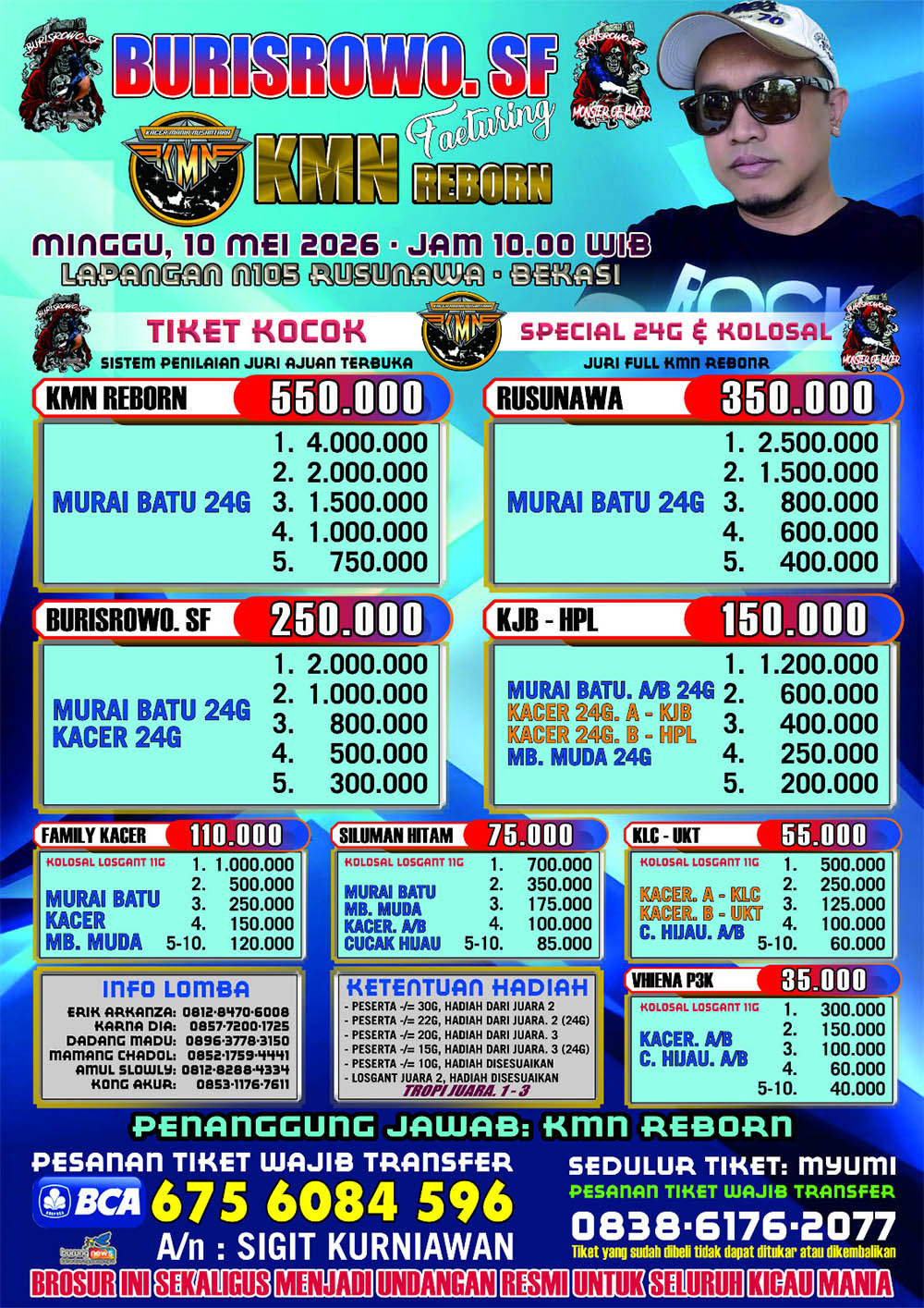 BURISROWO SF FEAT KMN REBORN LAP. N105 RUSUNAWA Minggu, 10 Mei 2026 Jam 10:00 Diliput oleh burungnews.com DOWNLOAD BROSUR