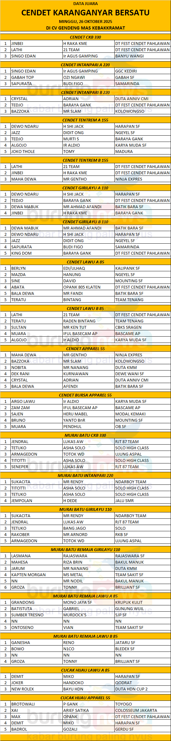 Cendet Karanganyar Bersatu yang diadakan pada Minggu, 26 Oktober 2025 di CV Gendeng Mas Kebakkramat, Karanganyar berlangsung ramai dan meriah. Event yang mengangkat kelas cendet ini dibuka sampai 11 kelas ditambah BOB ini diikuti oleh pemain Solo, Sukoharjo, Sragen, Purwodadi, Pati, Boyolali, Salatiga, Magetan, Ponorogo, Kediri, Purwakarta, dan lainnya.