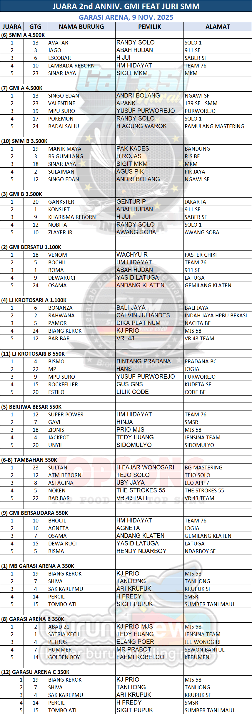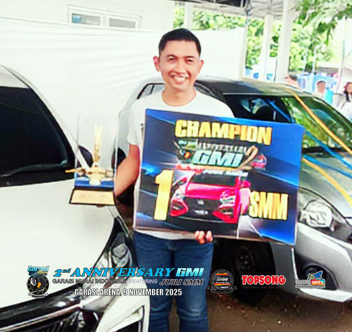 ua unit hadiah mobil yang tersedia dari dua kelas utama paket SMM dan GMI, masing-masing dimenangkan Avatar milik Randy Solo dan Singo Edan milik Andri Bolang. Event 2nd Anniversary GMI Feat Juri SMM, digelar Minggu 9 November 2025 di Garasi Arena Yogyakarta.