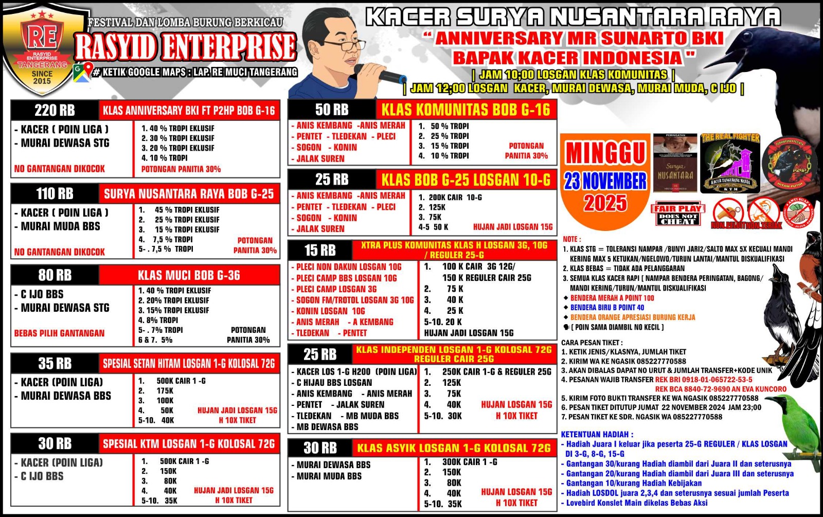 Para kicaumania kembali ditunggu di sejumlah event menarik, seperti SMR Road Show Panturan di Musiu Kretek Kudus (16/11), KMN Road Show Karawang (16/11), Viking Tour de Java di SHC (16/11), Anniversary Mr. Sunarto Kacer – BKI di RE-Muci Tangerang (23/11), Piala Pahlawan bersama SKN di Gresik yang menyediakan 2 hadiah mobil (30/11), Murai Batu Fair Battle bersama SPM di All Star Arena Bogor. [arik, busro, maltimbus]