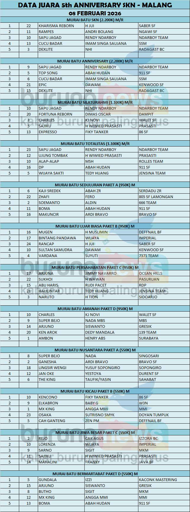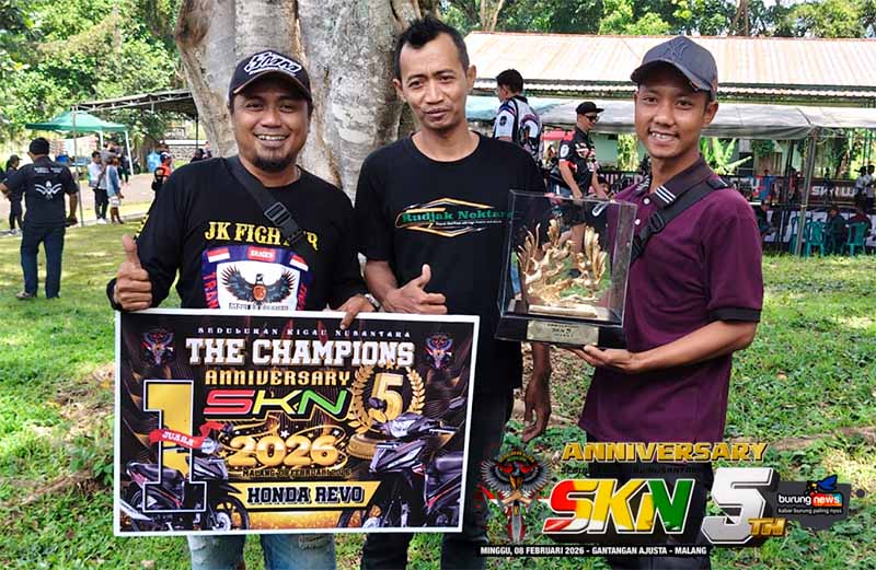 Sapu Jagad gaco andalan Rendy Ndarboy dari Jogjakarta berhasil merebut hasil hatrik juara pertama pada 5th Anniversary SKN yang berlangsung di gantangan Ajusta Singosari, Malang pada hari Minggu, 08 Februari 2026.