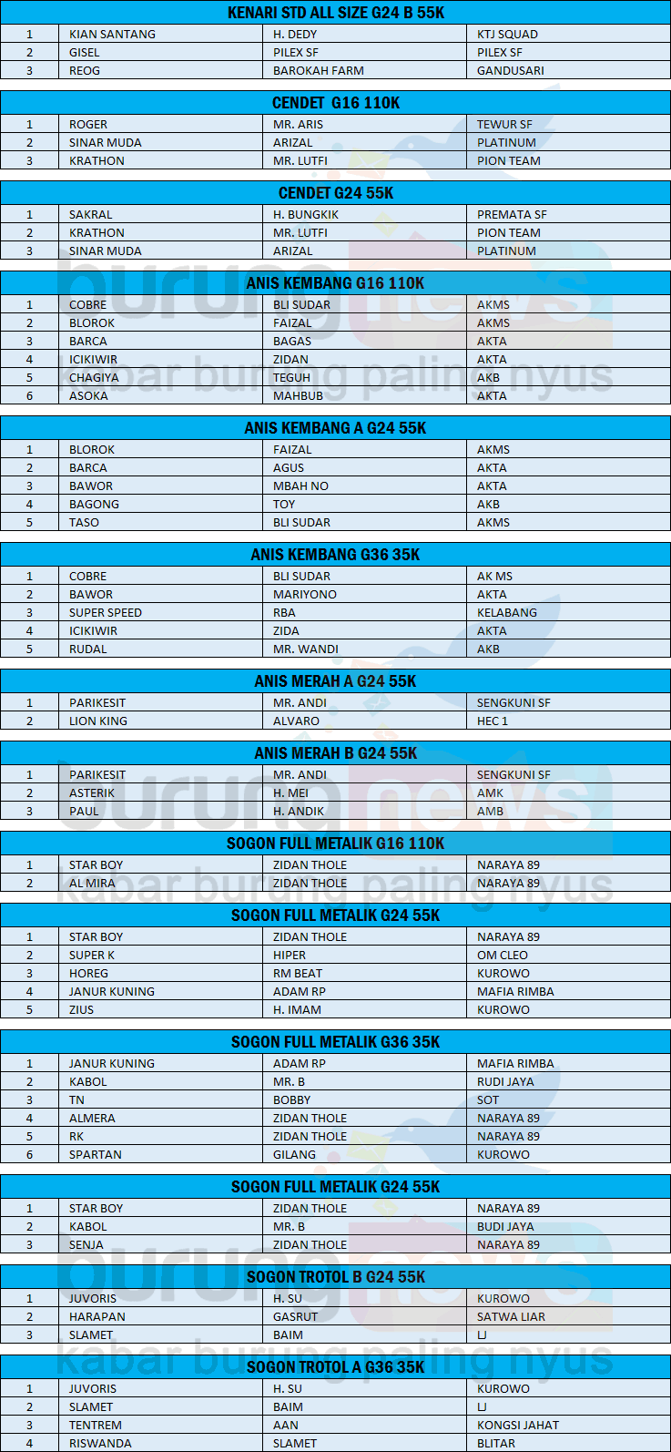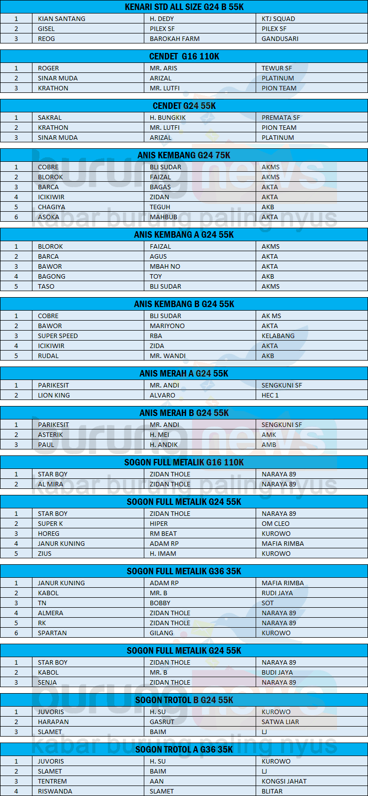 Kelas komunitas seperti sogon, anis kembang, anis merah, pesertanya full, demikian pula di kelas murai, cucak hijau dan kenari.