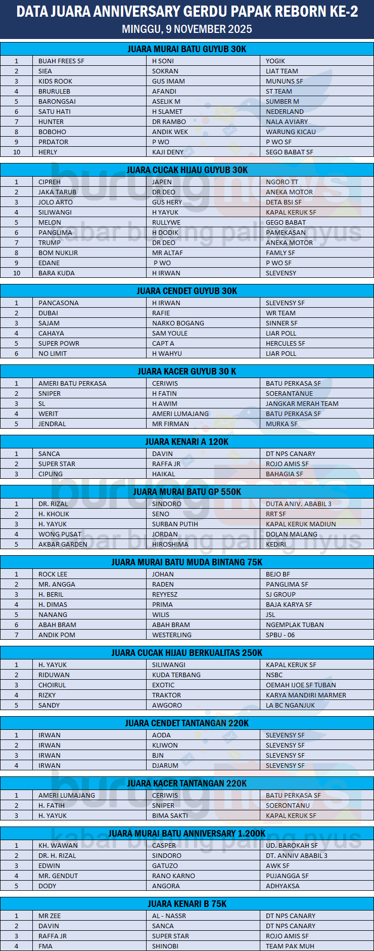 DATA JUARA ANNIVERSARY GERDU PAPAK REBORN KE-2, MINGGU, 9 NOVEMBER 2025