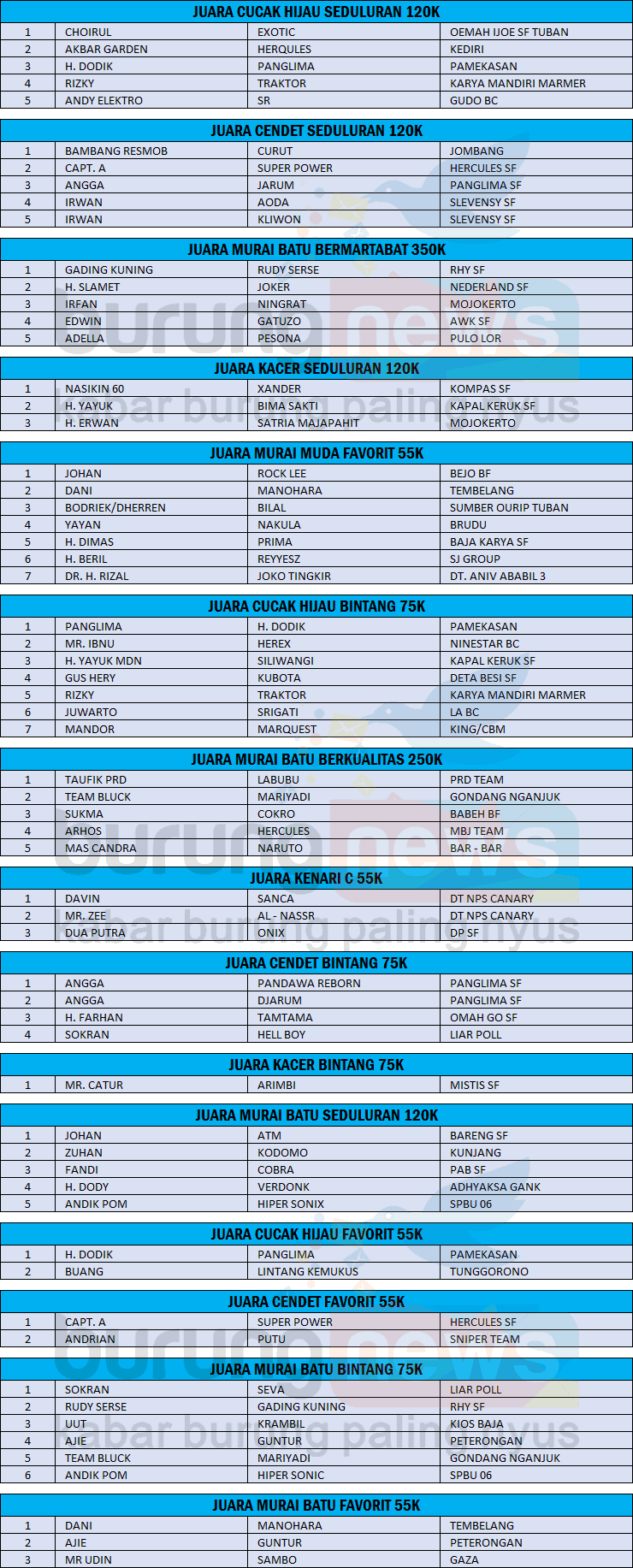 Dikelas utama Casper mampu membungkam lawan-lawannya, seperti Sindoro, Gatuzo, Rano karno Dan Anggora yang merupakan burung terbaik di Jawa Timur. Siapa saja jawaranya? Simak pada daftar juara dibawah ini. (ANGGA)