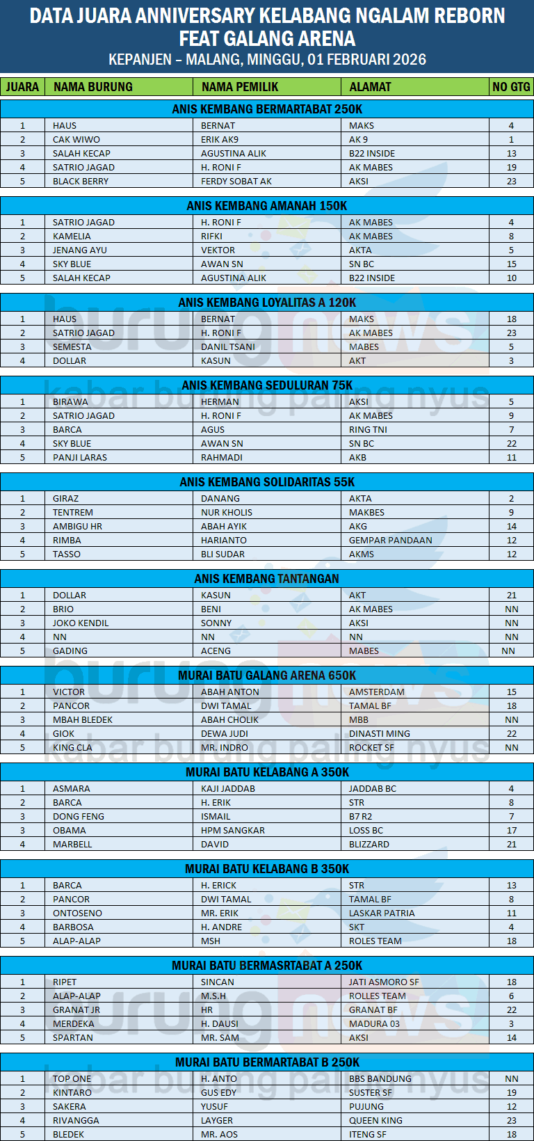 “Kita ucapkan terimakasih untuk Galang Arena sudah memfasilitasi anis kembang. Kami harap untuk ditahun-tahun depan lebih banyak lagi pesertanya, mungkin bisa mendatangkan AK Jawa - Bali untuk bisa main di Galang Arena,” harapnya.