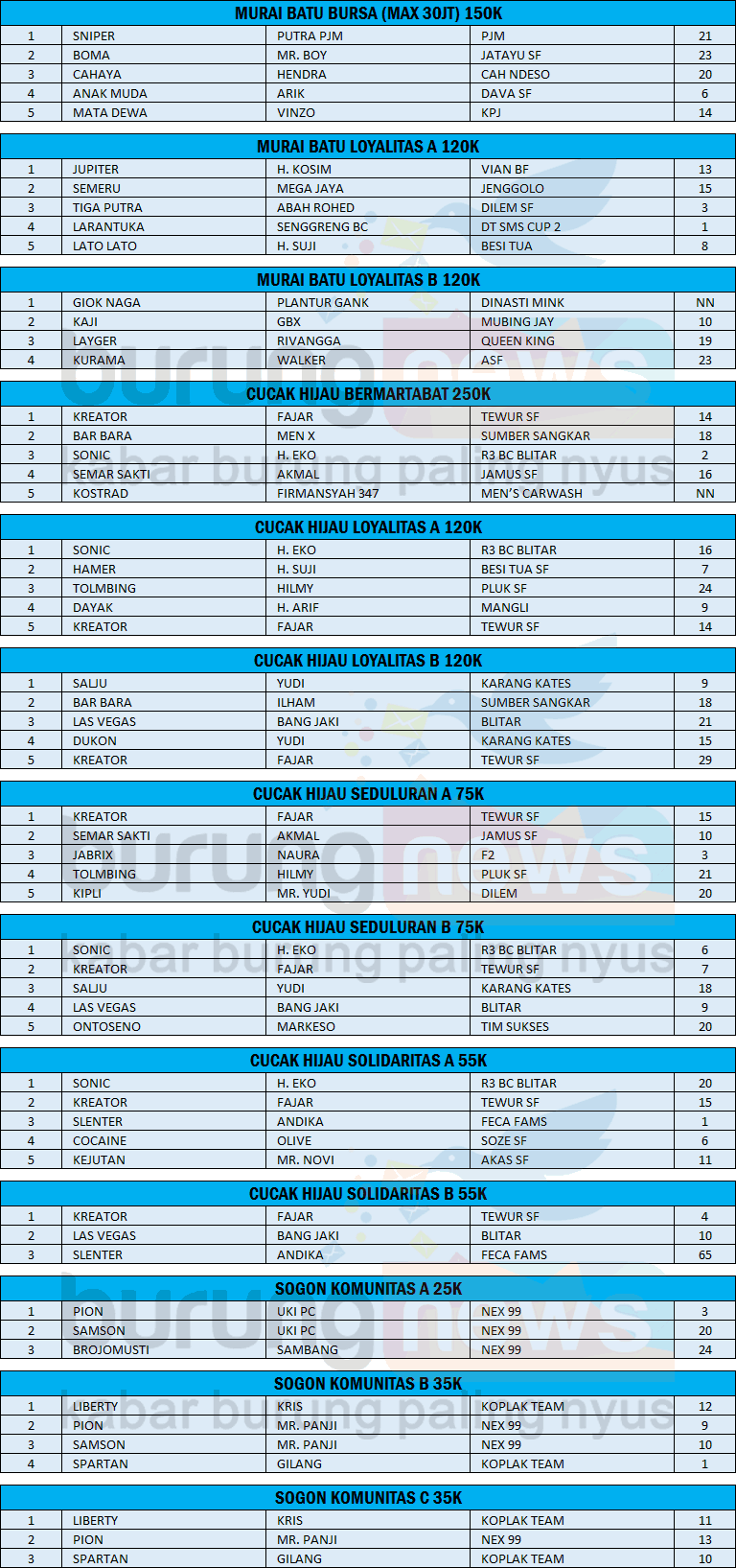 Menerapkna all class G-24 dan semua sesi yang di helat rata-rata full gantangan, baik anis kembang, murai batu, cucak hijau maupun sogon.