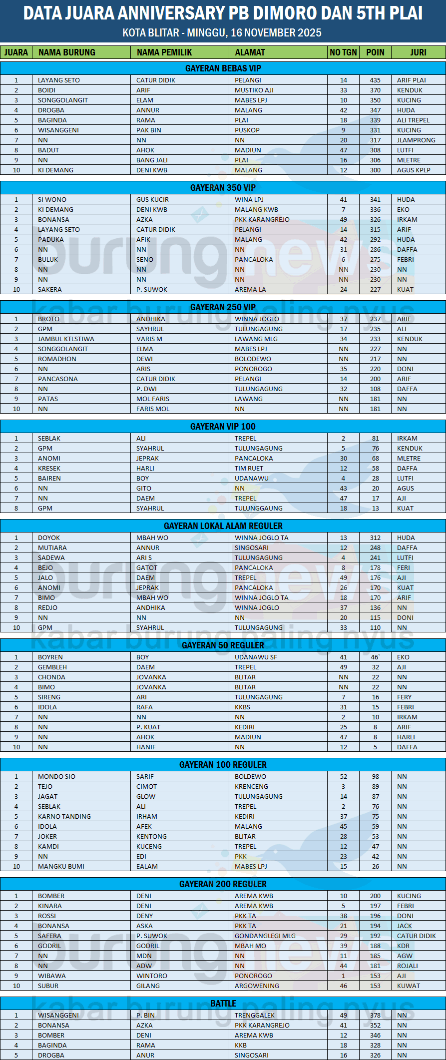 Wisanggeni milik Mr. Bino dari Trenggalek akhirnya berhasil podium satu dengan poin 378. Kelas utama Gayeran Bebas VIP di puncaki Layang Seto besutan Mr.Catur Didik dari Pelangi Blitar dengan poin 425. Gayeran Lokal Alam Reguler juara satunya diraih Doyok milik Mbah Wo dari Winna Joglo Tulungagung, poin 312.
