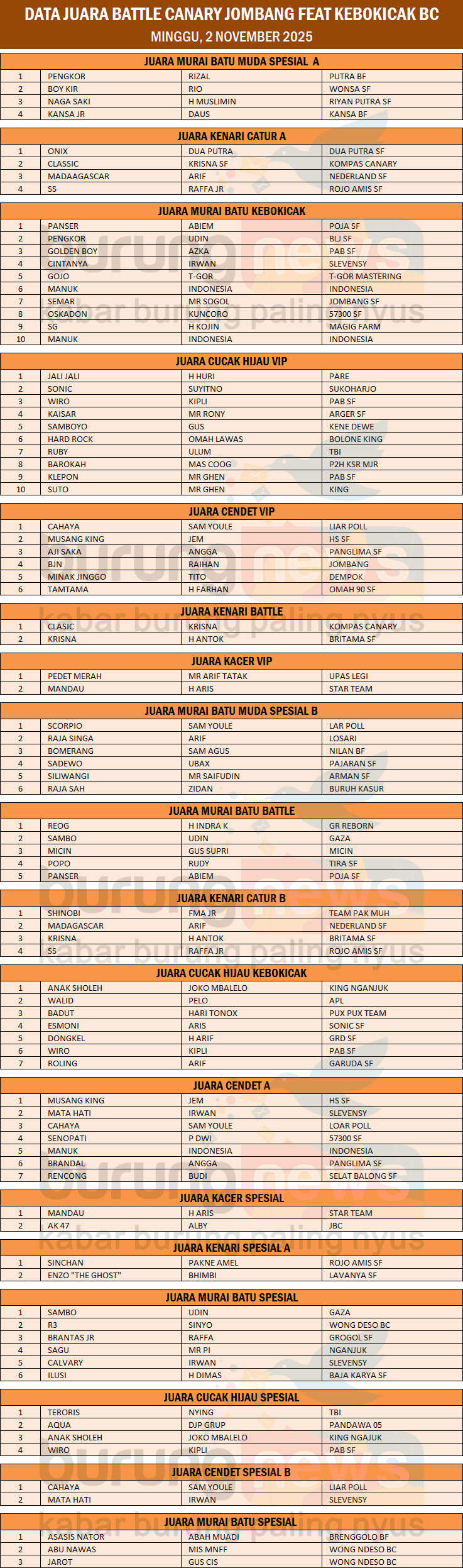 DATA JUARA BATTLE CANARY JOMBANG FEAT KEBOKICAK BC
