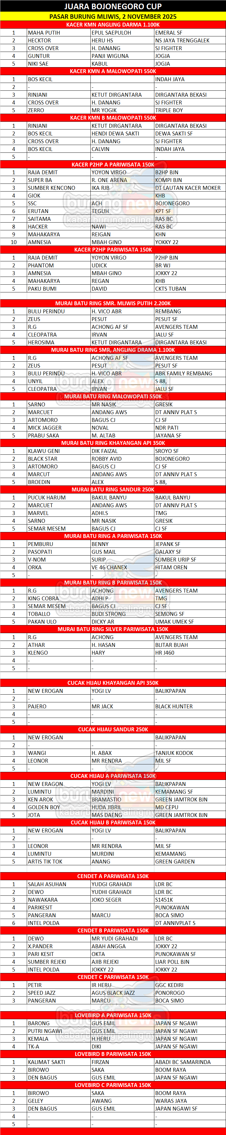 Gelaran Bojonegoro Cup untuk memperingati Hari Jadi ke-348 Kabupaten Bojonegoro bersama PBI Cabang Bojonegoro sudah berlangsung Minggu 02 November 2025 di Pasar Burung Mliwis. Peserta datang dari berbagai daerah.