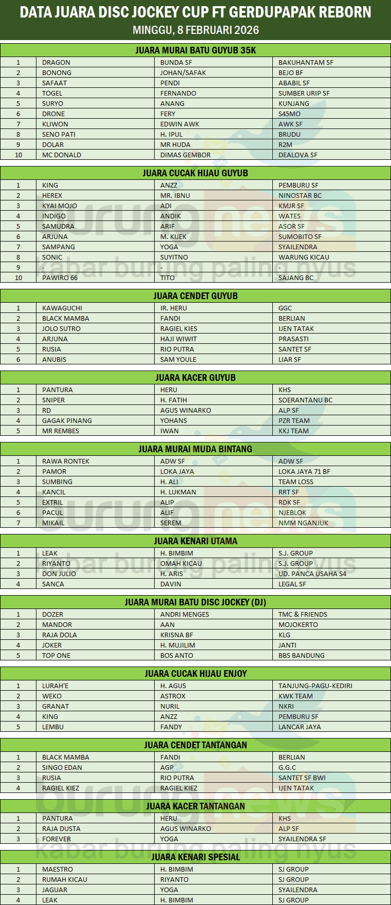 Gelaran prestisius Disc Jockey Cup 1 feat Gerdu Papak Reborn sukses besar dengan total 26 kelas yang seluruhnya terisi penuh. Jumlah burung yang bertarung di atas gantangan pun maksimal, tanpa satu pun celah kosong. Ajang ini dibuka dengan banderol tiket bervariasi, mulai dari Rp550.000, Rp350.000, Rp250.000, Rp220.000, Rp120.000, Rp75.000, Rp55.000, hingga Rp35.000.