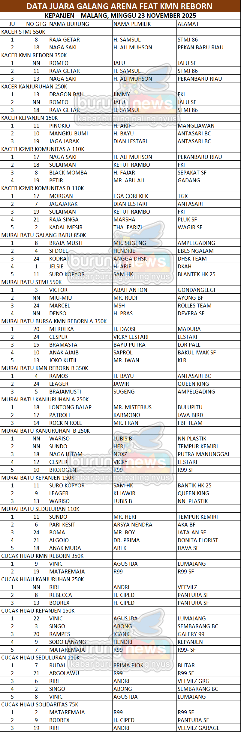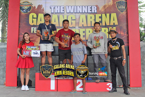 Megah dan meriah, event Galang Arena Feat KMN Reborn, Minggu 23 November 2025 di jalan Trunojoyo, Kanjuruhan, Kepanjen Malang. Selain kelas Murai Batu, Kacer dan Cucak Hijau juga menyedot animo yang besar.