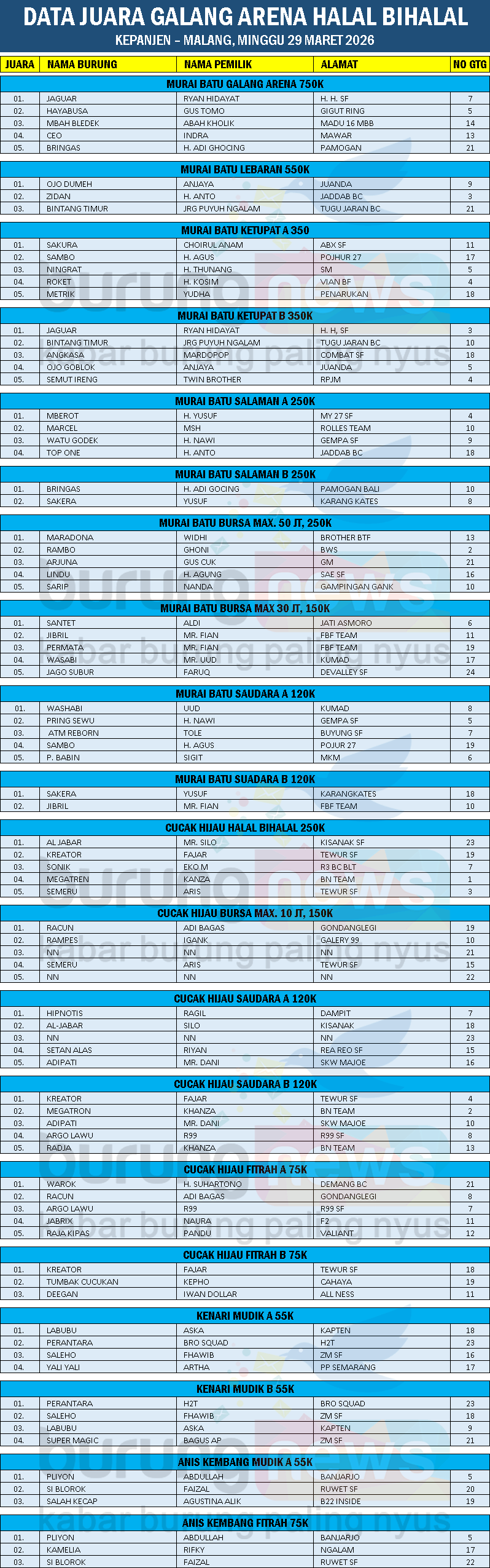 Sedangkan di kelas cucak hijau tiket utama Halal Bihalal 250K dengan hadiah sepeda listrik diraih Al Jabar milik Mr. Silo dari Kisanak SF.