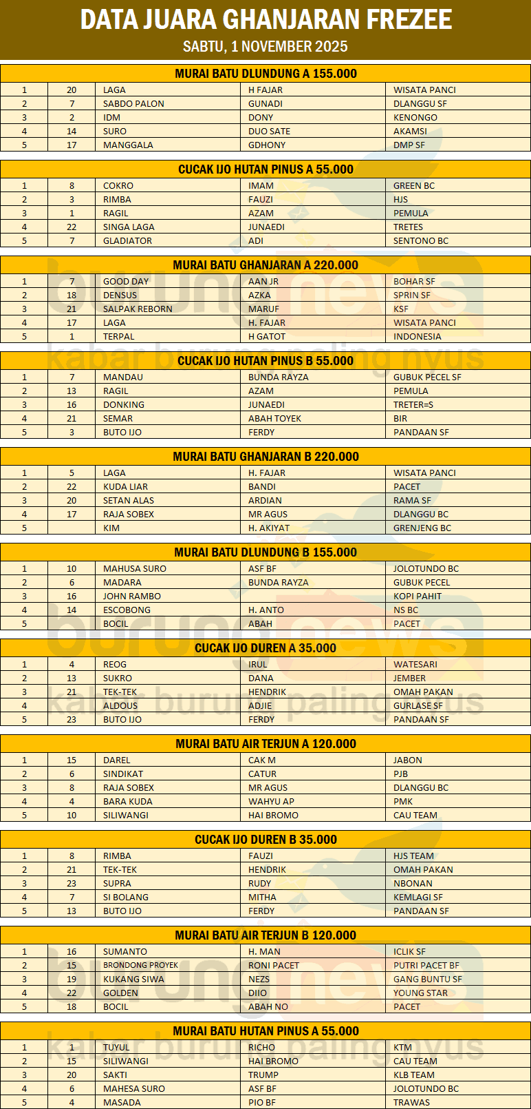 Latber rutin Ghanjaran Stadium, Sabtu, 1 November 2025 berjalan meriah. Kelas murai batu dan cucak ijo semuanya full pesertanya.