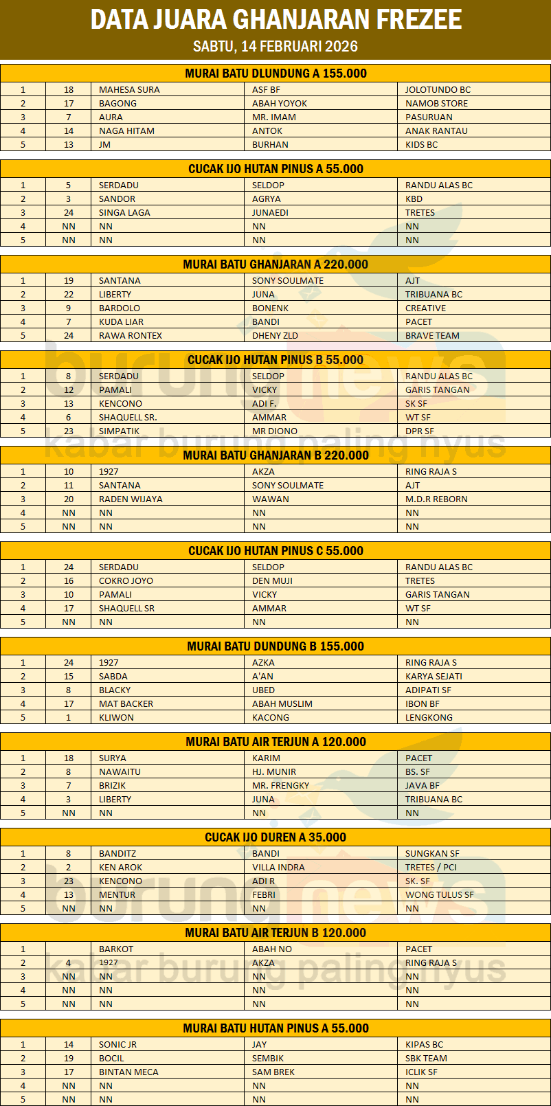Latber rutin Ghanjaran Stadium, Sabtu, 14 Februari 2026 berjalan lancar dan sukses. Kelas yang dimainkan adalah murai batu dan cucak ijo.