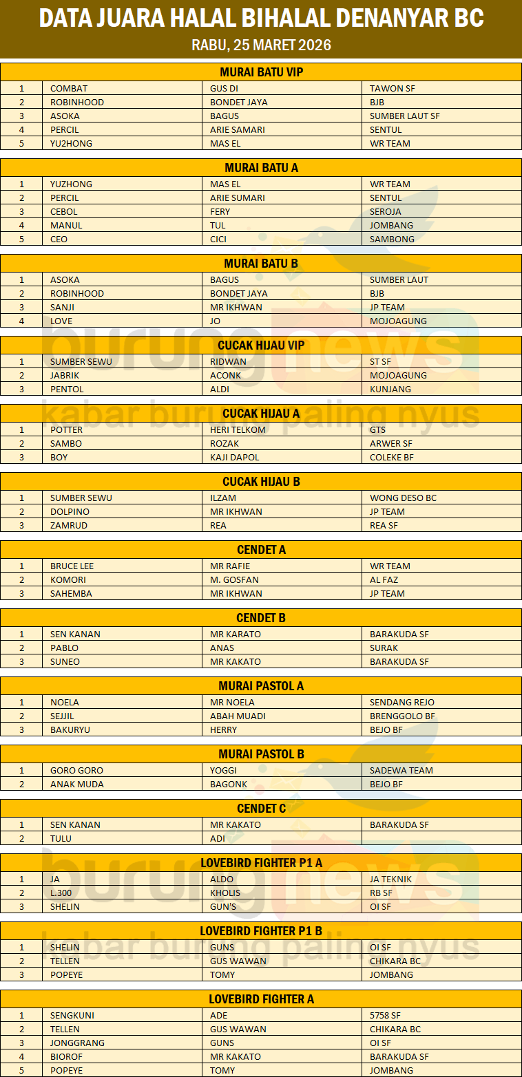 Gelaran Denanyar BC yang berlokasi di Pasar Desa Denanyar Jombang, Rabu, 25 Maret 2026 berjalan lancar dan sukses. Dihadiri kicau mania murai batu, cendet dan lovebird dari berbagai kota seperti Mojokerto, Kediri, dan Nganjuk.