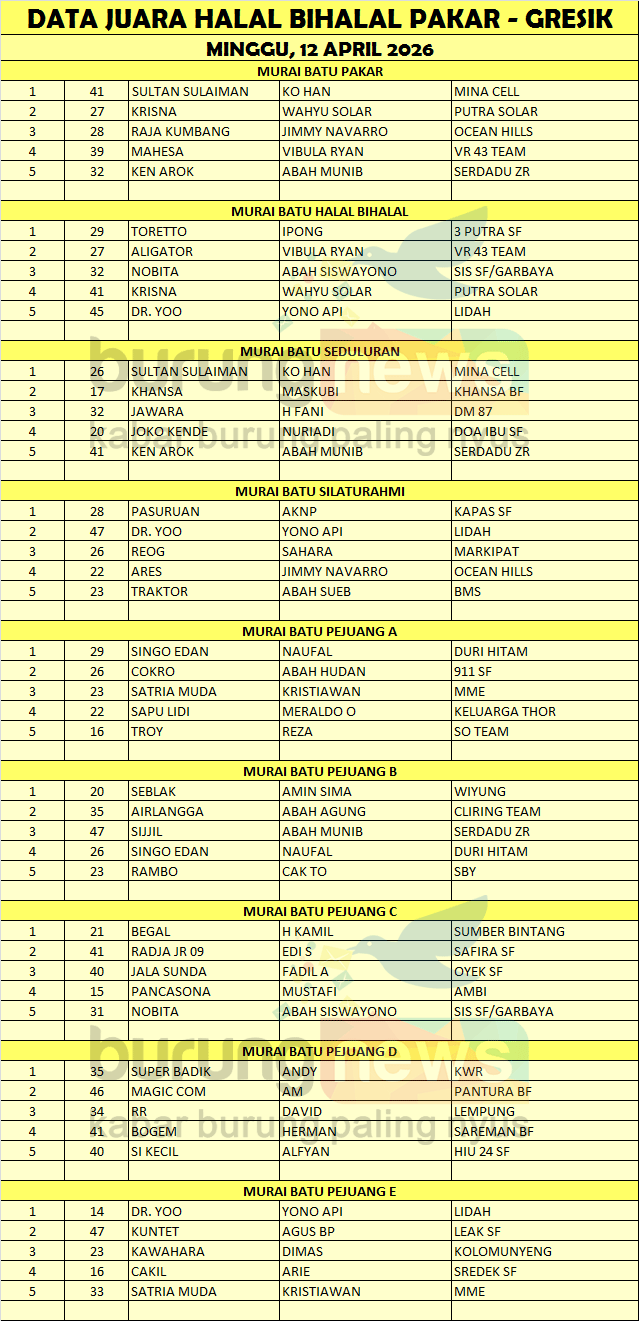 Sultan Sulaiman gaco Ko Han berhasil meraih hasil nyeri plus juara di kelas utama pada Halal Bi Halal PAKAR yang berlangsung hari Minggu, 12 April 2026 di Gantangan RS Arena 99 Driyorejo Gresik. Aligator gaco Vibula Ryan nyaris meraih hasil hatrik.