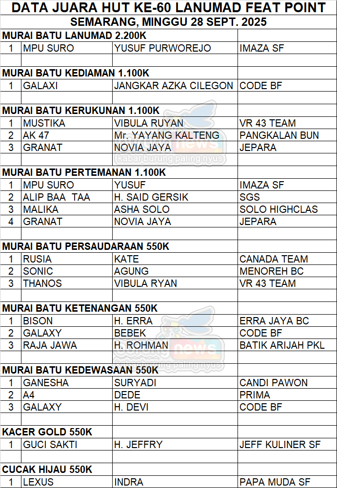 Para juara HUT ke-60 Lanumad Feat Point, bisa disimak di bawah ini. Simak juga sejumlah brosur lomba berikutnya yang direkomendasikan burungnews.com.