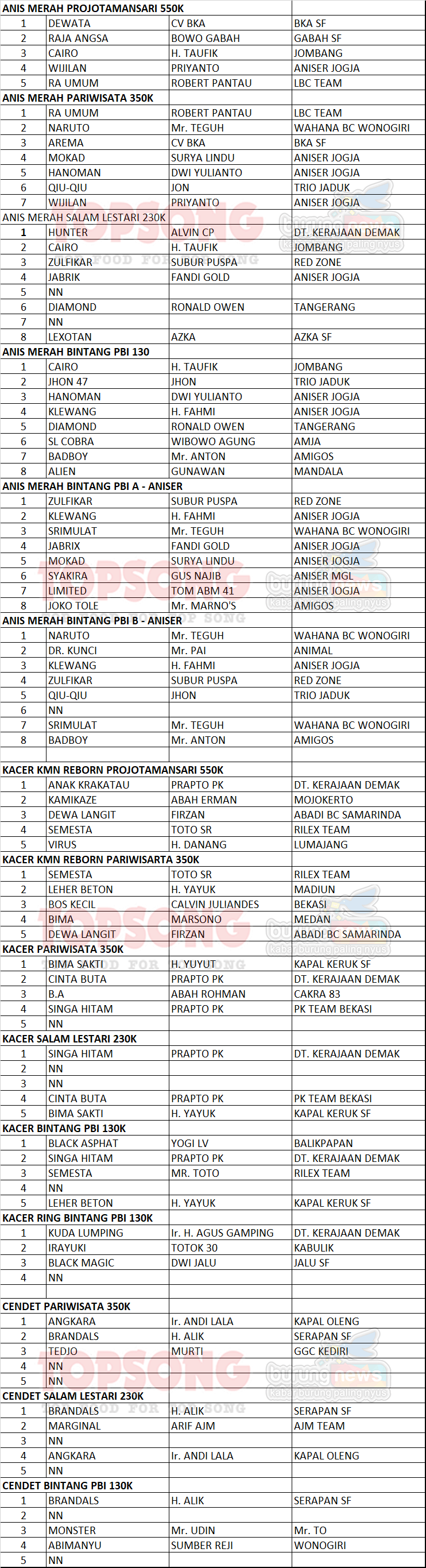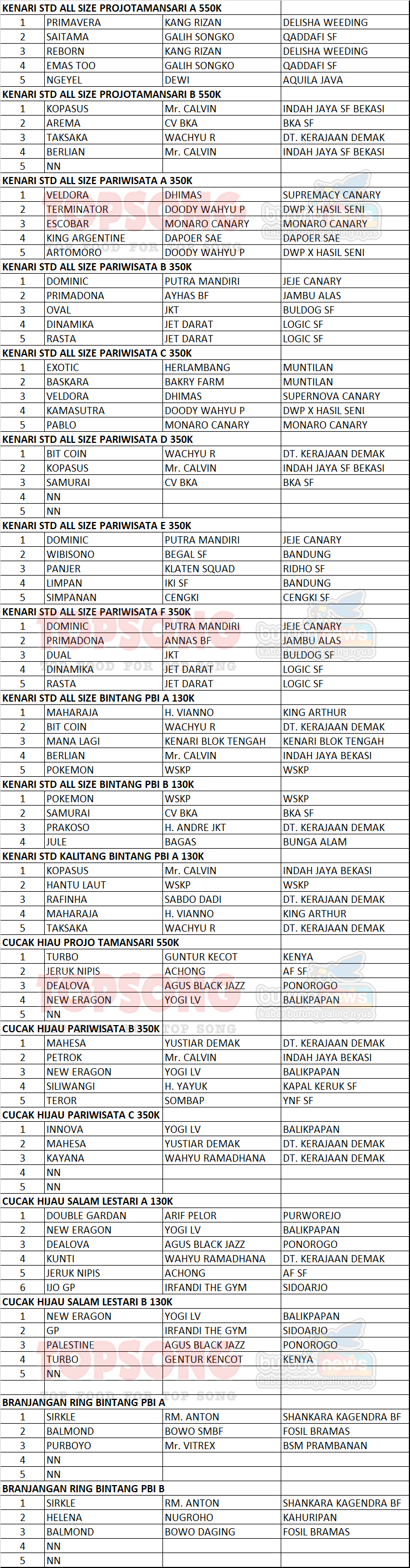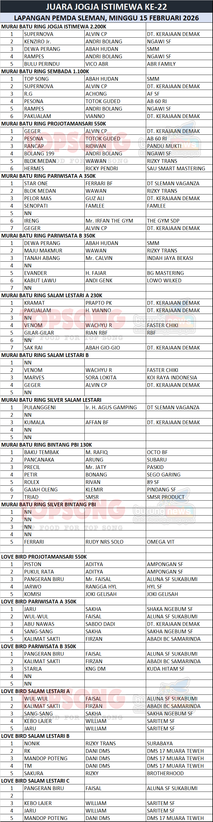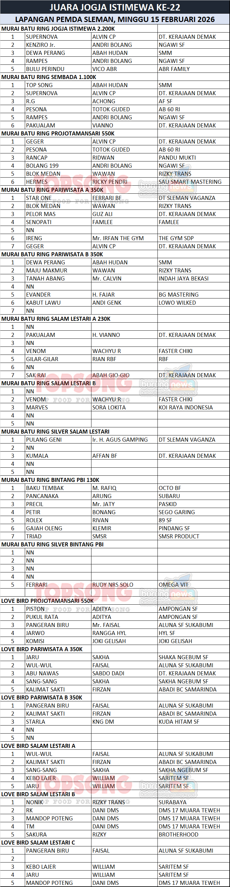 MERASA JUARA DATA KOSONG ATAU TERTULIS KURANG TEPAT, BISA MENGAJUKAN SUSULAN / PERBAIKAN. TULIS FORMAT: KELAS / JUARA / NAMA BURUNG / PEMILIK / ALAMAT, kirim ke admin WA 0817.0251.279, disertai foto piagam / tropi sebagai bukti.