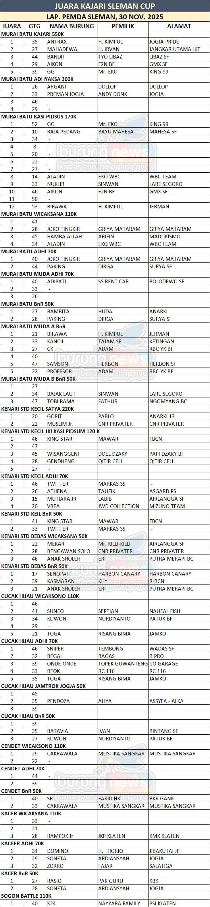 Kelas Utama Kajari tiket 550K 24-G bisa full peserta, dengan hadiah utama sepeda motor Yamaha Gear baru diserahkan langsung oleh Kajari kepada Tedi BKS yang mengawal. Demikian pula kelas kolosal Kasi Pidsum 170K, pesertanya juga bisa di atas 60 burung dari gantangan tersedia 72.