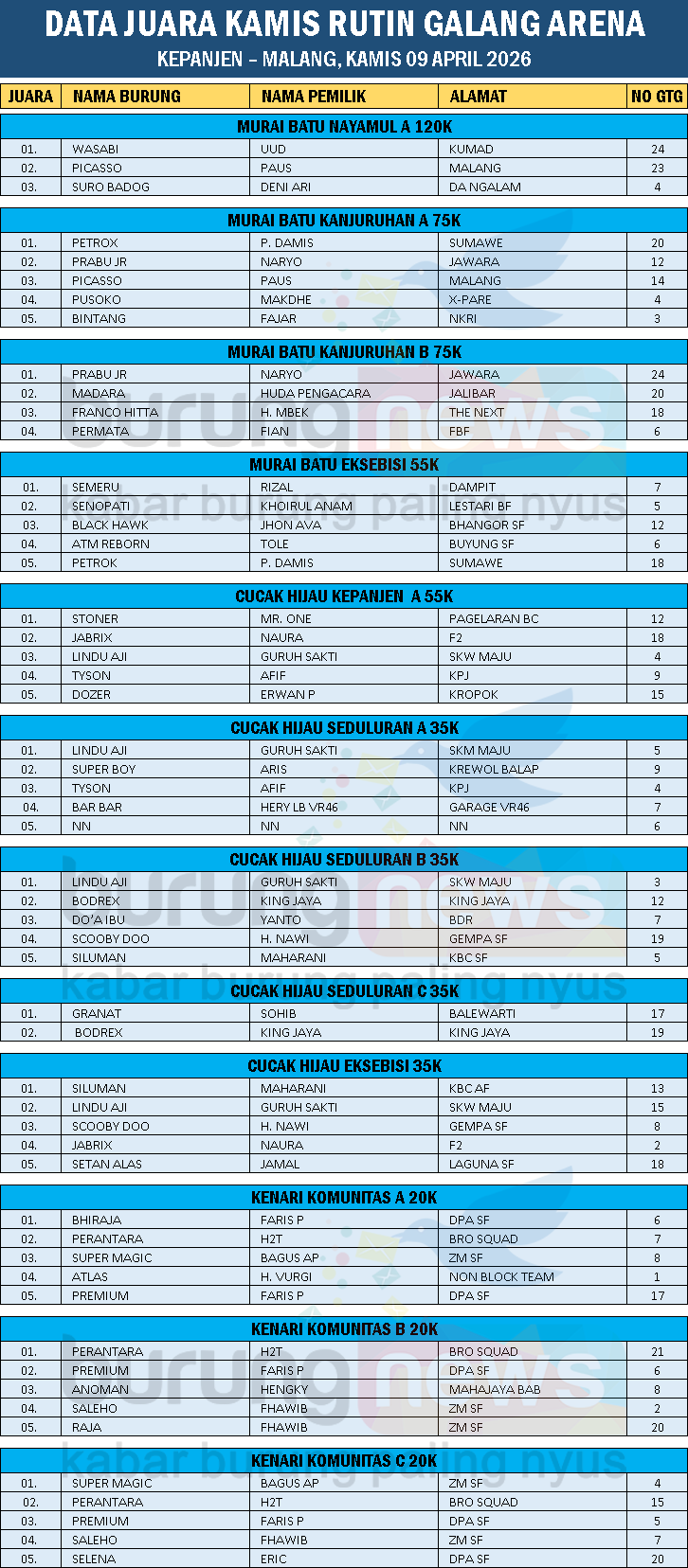 DATA JUARA KAMIS RUTIN GALANG ARENA, KEPANJEN – MALANG