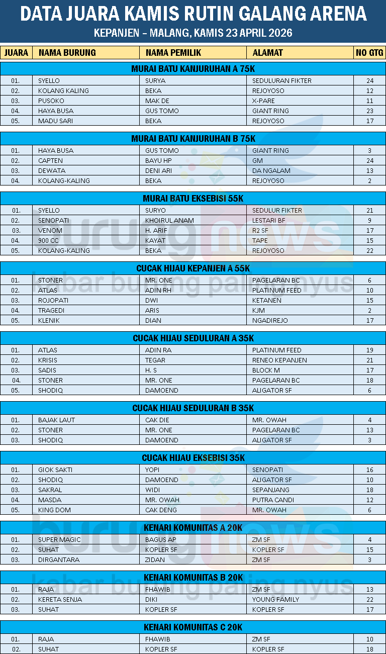 Murai batu, cucak hijau dan kenari pesertanya stabil di Kamis Rutin Galang Arena, 23 April 2026, di JL. Trunojoyo, Kepanjen, Kab. Malang.