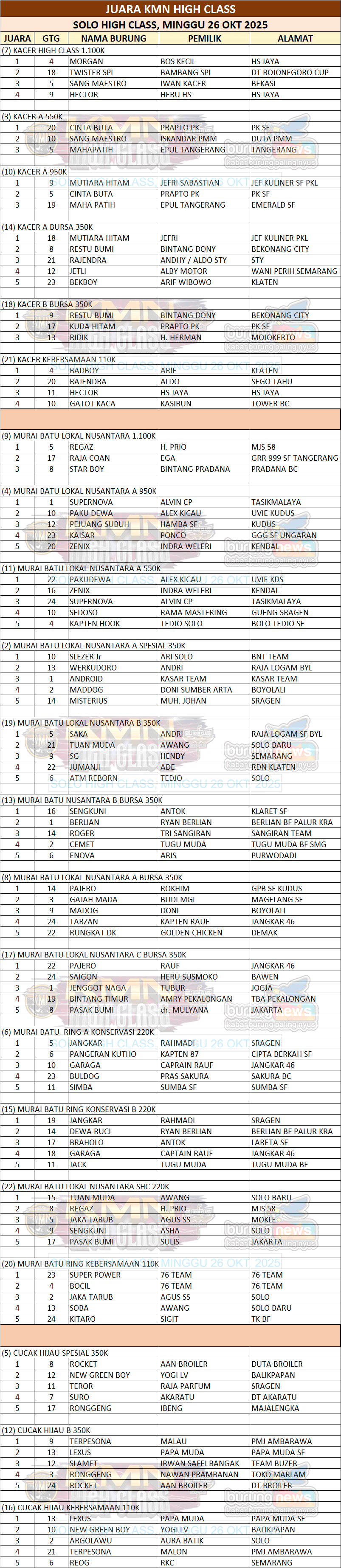 Seperti biasanya, kemeriahan memenuhi arena Solo High Class setiap kali ada event, seperti KMN High Class pada Minggu 26 Oktober. Kelas-kelas Murai Batu selalu full, Cucak Hijau hanya kosong 1 gantangan. Kacer yang ingin diangkat pamornya, justru masih bolong-bolong.