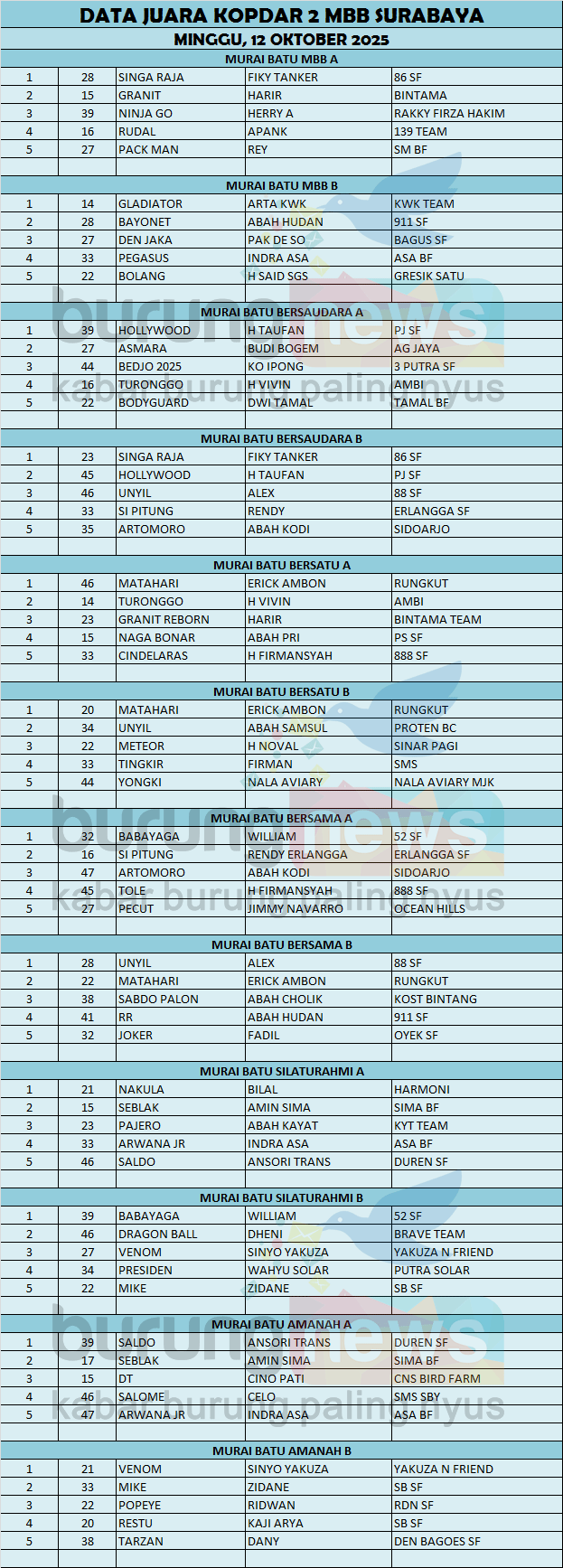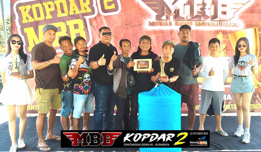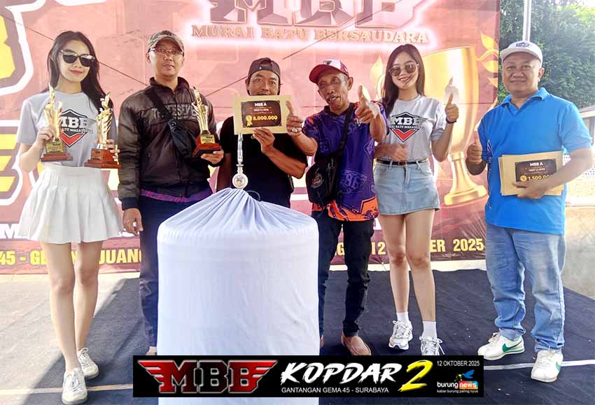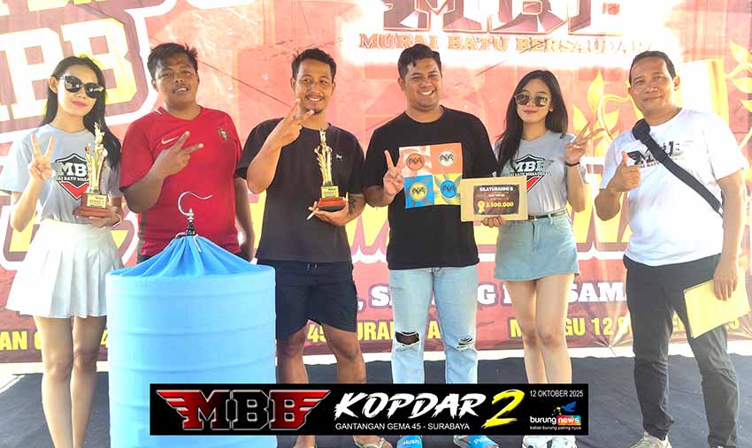 Ada tiga burung yang berhasil meraih hasil nyeri juara pertama pada Kopdar 2 MBB (Murai Batu Bersaudara) hari Minggu, 12 Oktober 2025 di Gantangan GEMA 45 Surabaya. Singa Raja, Matahari, dan Babayaga.