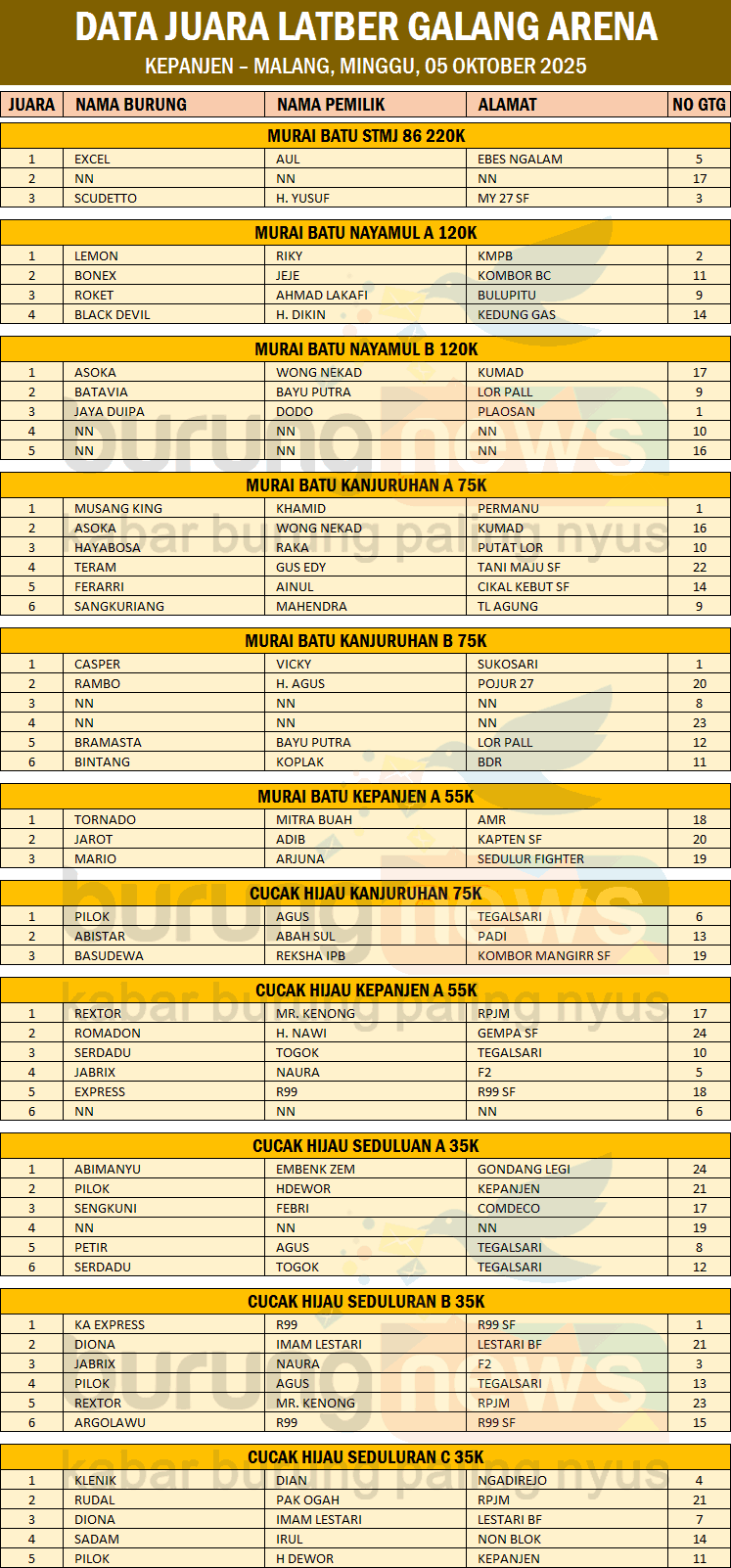 Pertarungan murai batu utama STMJ 86 220K masih menjadi partai neraka di latber Galang Arena, Minggu 05 Oktober 2025. Exel milik Mr. Fahrul dari Ebes Ngalam Pagelaran harus berjibaku untuk meraih posisi puncak.
