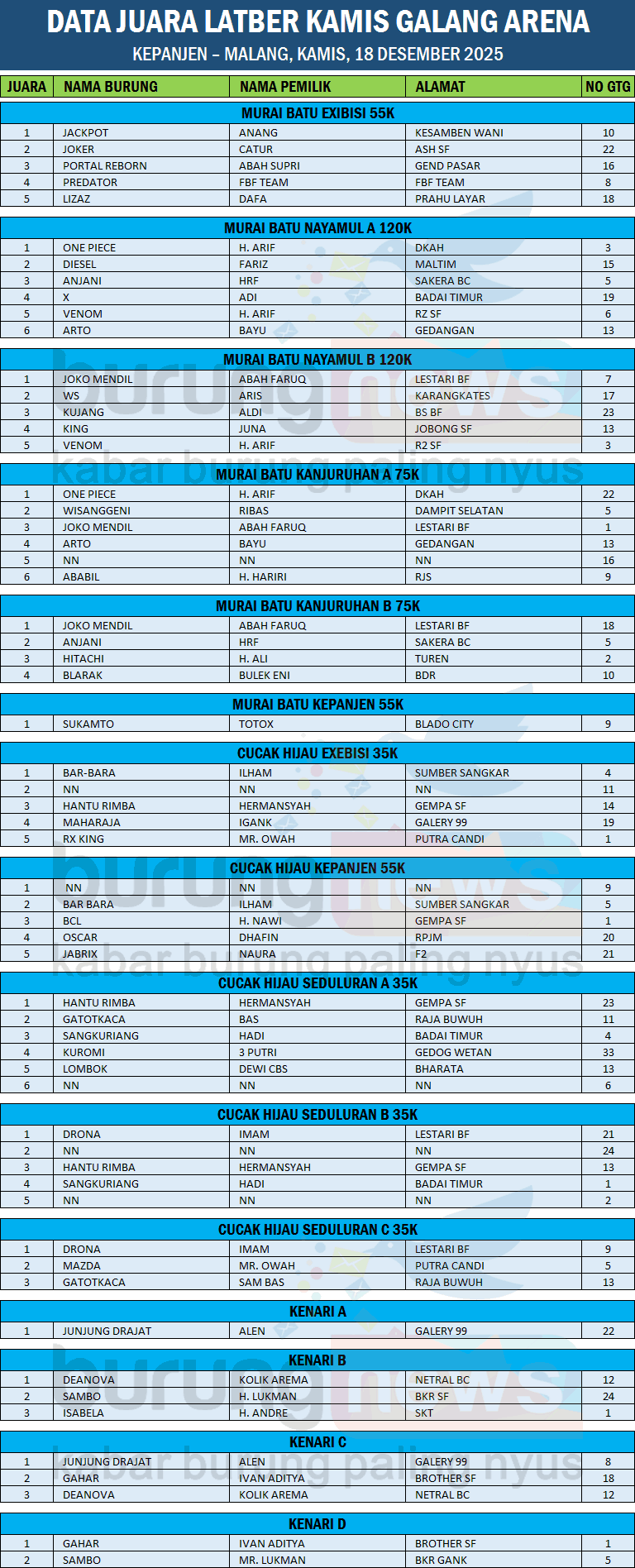 Latber Kamis Galang Arena (18/12/2025) di Jl. Trunojoyo, Kepanjen Malang tambah seru, banyak gaco yang bisa meraih double winner, baik di kelas murai batu, cucak hijau maupun kenari.
