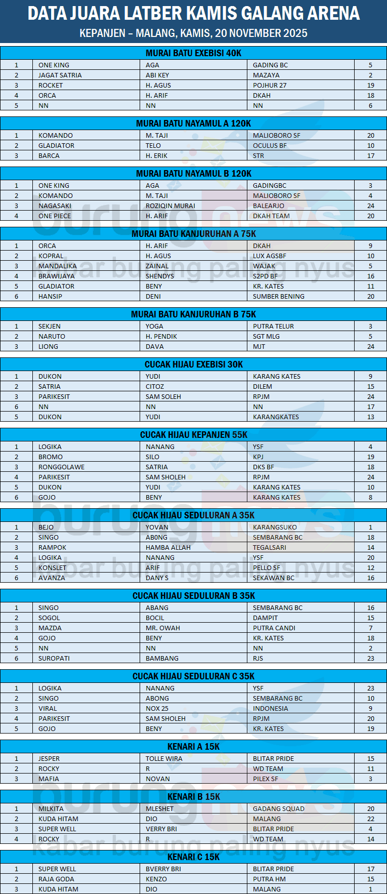 Meski diguyur hujan lebat, Latber Kamis Galang Arena (20/11/2025) di Jl. Trunijoyo, Kanjuruhan Kepanjen Malang, tetap di padati kicau mania.