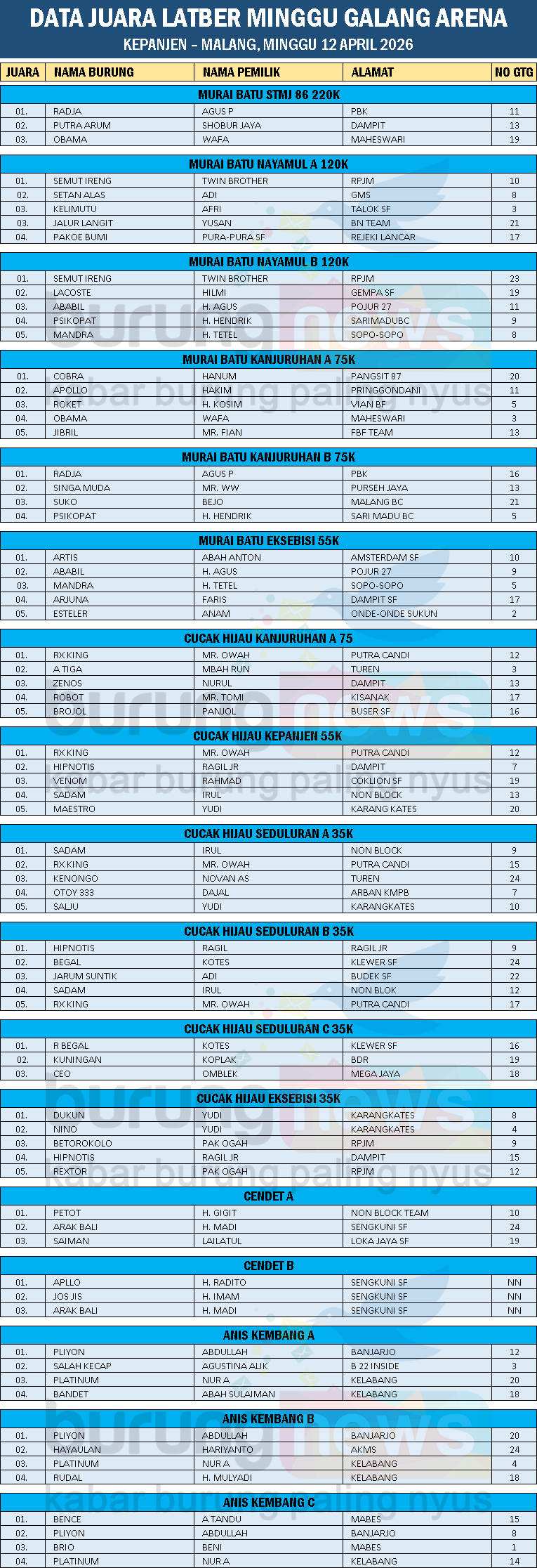 DATA JUARA LATBER MINGGU GALANG ARENA, KEPANJEN – MALANG