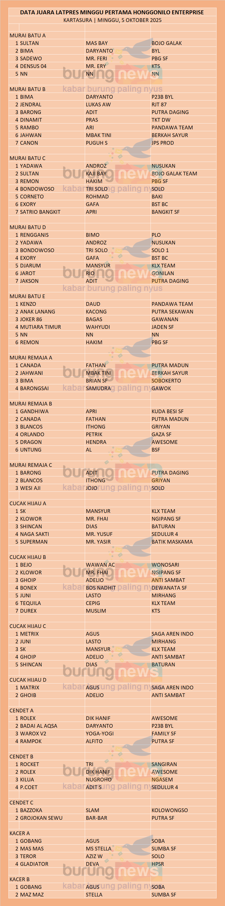 Murai batu Sultan milik Mas Bay berhasil meraih juara pertama di kelas utama Murai Batu A Latpres Honggo Nilo Enterprise. Di akhir gelaran, Rinto mengungkapkan kesiapannya untuk menggelar Lurah Cup I Gonilan pada Minggu, 2 November 2025.