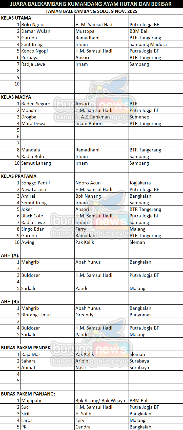 Para juara selengkapnya, bisa dilihat di bawah ini. Lomba Ayam Hutan dan Ayam Bekisar kali ini, adalah dalam rangkaian Balekambang Kumandang yang sudah digelar sejak hari Sabtu 8 November 2025 yaitu Derkuku dan Kenari. Untuk Minggu 9 November, melombakan Ayam Hutan, Ayam Bekisar, dan burung berkicau dengan team juri dari PBI.