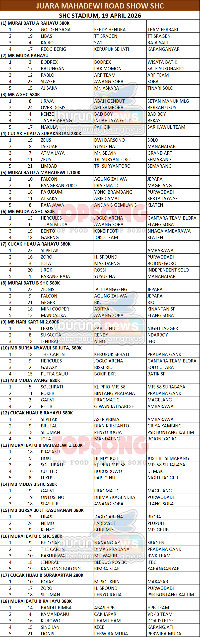 Sejumlah gaco papan atas nasional bertarung di Mahadewi Road Show SHC, Minggu 19 April 2026. Banyak gaco tampil apik dan membuat kejutan, sementara jago mapan masih terus mempertahankan posisinya.