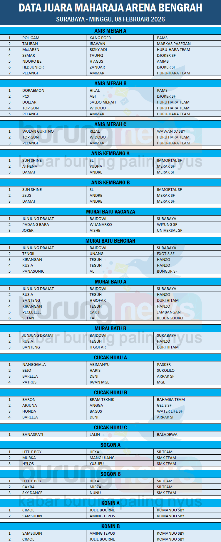 DATA JUARA MAHARAJA ARENA BENGRAH - SURABAYA (MINGGU, 08 FEBRUARI 2026)