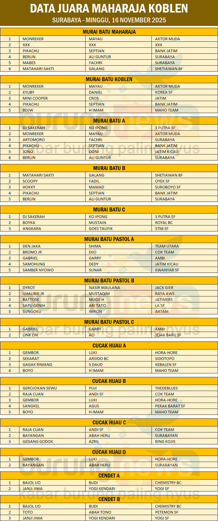 DATA JUARA MAHARAJA KOBLEN - SURABAYA (MINGGU, 16 NOVEMBER 2025)