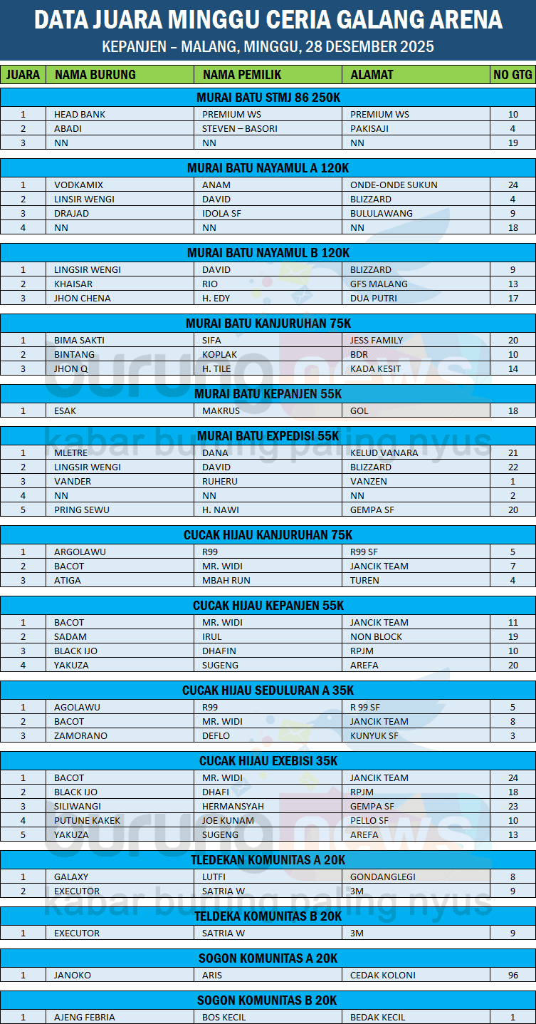 DATA JUARA MINGGU CERIAH GALANG ARENA, KEPANJEN – MALANG